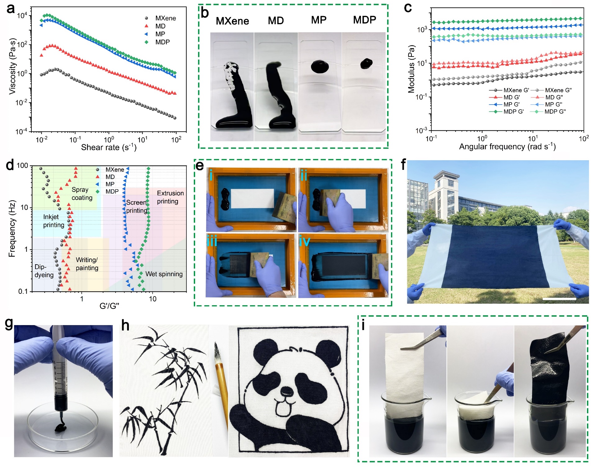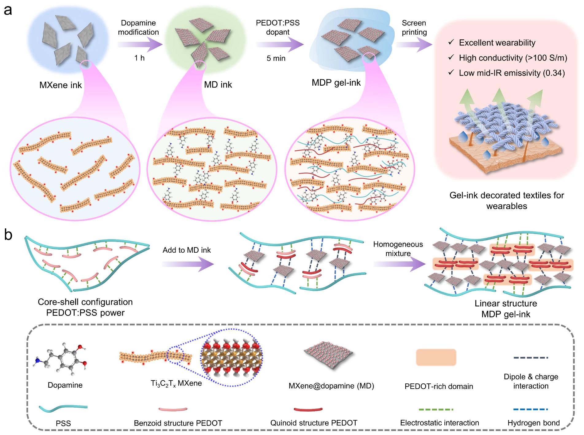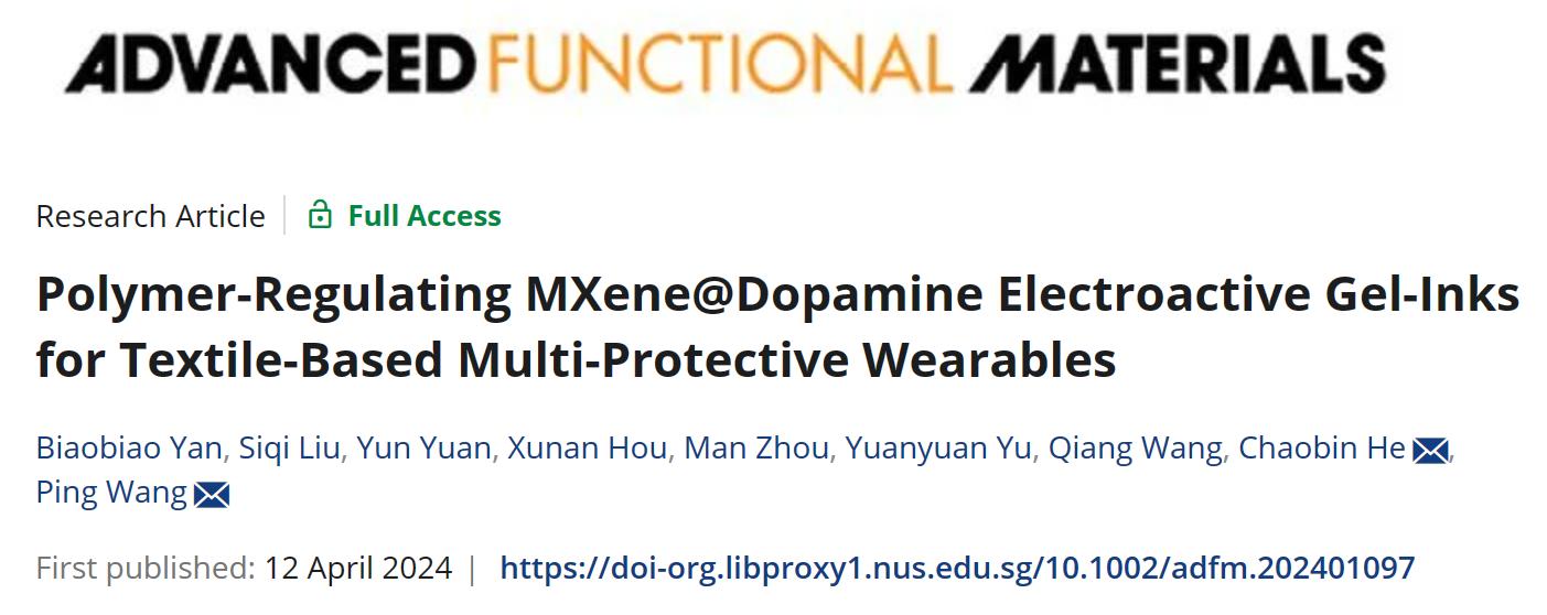 生态染整研究室王平教授和新加坡国立大学Chaobin He教授合作,在材料领域国际顶级期刊《Advanced Functional Materials》发表题为“Polymer-Regulating MXene@Dopamine Electroactive Gel-Inks for Textile-Based Multi-Protective Wearables”的研究论文。