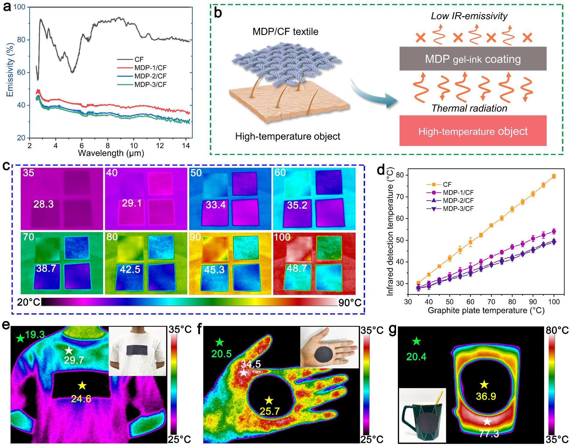 与浸涂或浸轧加工方式相比,丝网印刷具有介质利用率高、涂层均匀稳定、可根据个性化需求进行精准图案设计等优点。为了调节导电油墨的流变性、提升织物表面涂层的结合牢度,通常会在油墨中添加化学增稠剂和粘合剂,易造成织物手感下降和导电通路受塞等弊端,影响了导电纺织品的应用性能。因此,在满足良好的流变性及与纺织品高牢度结合的前提下,如何获得导电性优良的稳定油墨是该领域待解决的关键问题。本文借助于导电聚合物PEDOT:PSS配制MXene基油墨,在提升电活性介质利用率的同时,实现高导电涂层纺织品可扩展、大面积的制备。使用PEDOT:PSS作为掺杂剂调控油墨流变性,获得具有高粘弹性的凝胶油墨,并通过丝网印刷方式制备导电纺织品。MXene纳米片与PEDOT:PSS之间具有电荷偶极相互作用,增强了油墨中纳米片之间的作用力,通过改变PEDOT:PSS掺杂量可灵活调控油墨粘度值在1-104Pa·s之间;印刷导电涂层轮廓清晰,电活性介质利用率近100%,电导率高达109.6 S/m。采用该导电油墨印制的纺织品具有多功能防护性,EMI SET值可达23 dB(单层,X波段),在中红外波段的平均发射率为0.328,可用于高温物体热伪装。通过切换被动低辐射加热、主动太阳能与焦耳加热模式,可在低能耗下实现为人体持续精准供暖,纺织品同时具有良好的耐弯曲性和储存稳定性。