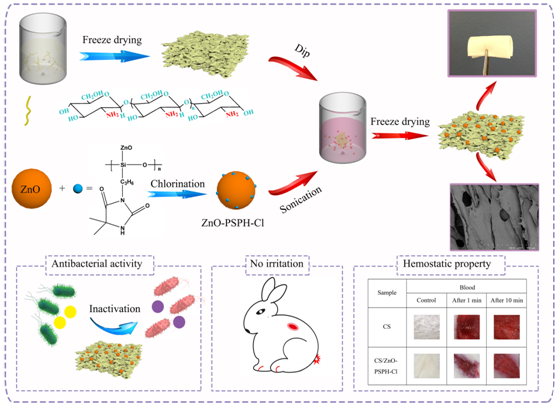 复合材料设计过程,形貌,抗菌性能,止血性能及刺激性测试示意图