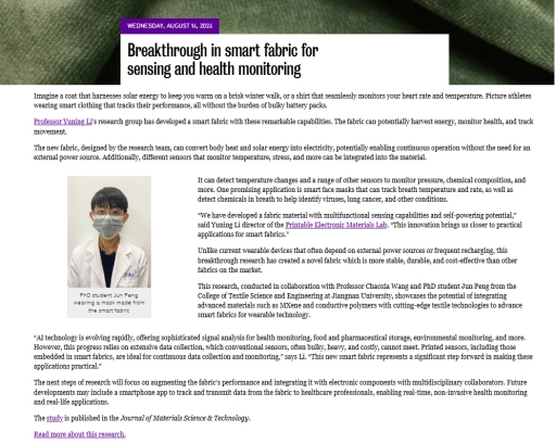 该研究工作受到了滑铁卢大学的高度关注和认可,滑铁卢大学官方媒体对Yuning Li 教授进行了相关研究内容采访,分别在滑铁卢大学新闻官方网站(Power up your health with self-sustaining electronics | Waterloo News | University of Waterloo (uwaterloo.ca) )和化学工程学院网站(Breakthrough in smart fabric for sensing and health monitoring | Chemical Engineering | University of Waterloo (uwaterloo.ca) )进行报道。