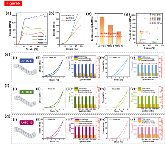 针对这一挑战,本研究利用针织全成形技术,成功研制出一种具有仿生结构特征的新型复合材料(HTC/AHTC)。这一突破性设计巧妙地将刚性螺旋构象与弹性可拉伸构象相结合,通过精准调控结构参数与次级构象的耦合状态,实现了对材料力学性能的"编程"。实验结果表明,该材料不仅完美复刻了天然韧带的非线性力学行为,更展现出优异的抗疲劳性能。这一进展不仅解决了人工韧带力学性能不匹配的核心难题,更为运动医学领域提供了全新的解决方案。