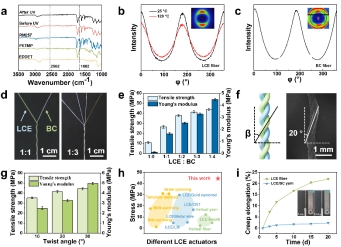 图2. a) 紫外线照射前后EDDET、PETMP、RM257和LCE纤维的傅立叶变换红外分析。b) LCE纤维和 c) BC纤维的2D-WAXS方位角图像。 d) 不同组分比的螺旋LCE/BC纱线致动器的光学图像。 e) 不同组分比的LCE/BC纱线致动器的拉伸强度和杨氏模量图。g) 不同捻度角的LCE/BC纱线致动器的拉伸强度和杨氏模量图。 h) 不同LCE纤维/纱线致动器的机械强度Ashby图。 i) 20天内LCE纤维和LCE/BC纱线的蠕变伸长率。