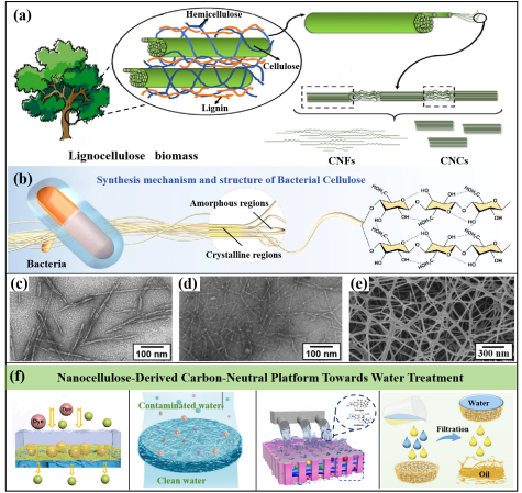 纳米纤维素主要分为三大类:纤维素纳米纤维(CNFs)、纤维素纳米晶(CNC)和细菌纤维素(BC),它们是由d -吡喃葡萄糖基通过β- 1,4连接的线性大分子,其形态、大小等特征因原料、提取方法和加工条件的不同而不同。CNFs的直径一般为20-50nm,长度为500-2000 nm,从植物纤维素分离得到。CNC是通过酸、酶或氧化剂对天然纤维素(如藻类、植物和木材)的无定形区域进行选择性水解或氧化降解而提取得到。BC是由醋酸杆菌等细菌通过生物技术合成的具有三维纳米纤维网络结构的纤维素材料。与以往报道的相关文献不同,本文系统地介绍了三类纳米纤维素从来源、提取、化学改性到功能性水处理材料制备的全过程,并提供了许多典型案例。重点介绍了纳米纤维素材料的独特性能、工作机理及其在水处理领域的应用前景,包括微/纳米颗粒过滤、染料/有机物吸附/降解、重金属离子吸附/检测、油水分离及海水淡化等。在此基础上,对连续规模化制造技术进行了深入探讨。最后,综述了纳米纤维素基功能材料在环境净化领域的潜在应用、机遇和未来挑战,我们相信在纳米技术、化学和材料科学等多学科交叉融合下,纳米纤维素基水处理材料的商业化应用将加速,同时也将向空气净化/过滤和二氧化碳分离等新兴领域发展。论文第一作者分别为海角社区