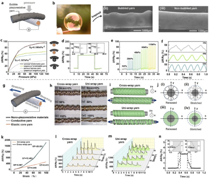 图2. 双模态传感纱结构设计与传感性能表征