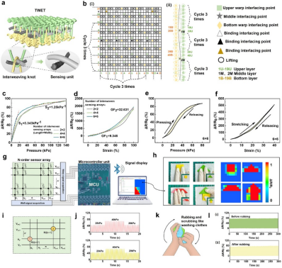 纺织研究所孙丰鑫研究团队基于“超构织物(meta-textile)”结构设计理念,开发出一种智能三重编织电子织物(TWET)。该织物不仅具备高灵敏度的多模态传感能力,还兼具红外辐射冷却与微液量的汗液快速传导等多重功能无缝集成,显著提升了穿戴过程中的热湿舒适性。这一“结构诱导功能”的超构织物设计理念,为新一代智能可穿戴设备提供了高度集成、可规模化生产的解决思路,展示出广泛的应用前景和工程化潜力,有助于推进可穿戴技术在户外运动、健康监测等领域的实际应用。相关成果以“Knot-Patterned Treble-Weaving Smart Electronic Textiles With Advanced Thermal and Moisture Regulation for Seamless Motion Monitoring”为题发表于《Advanced Functional Materials》,海角社区