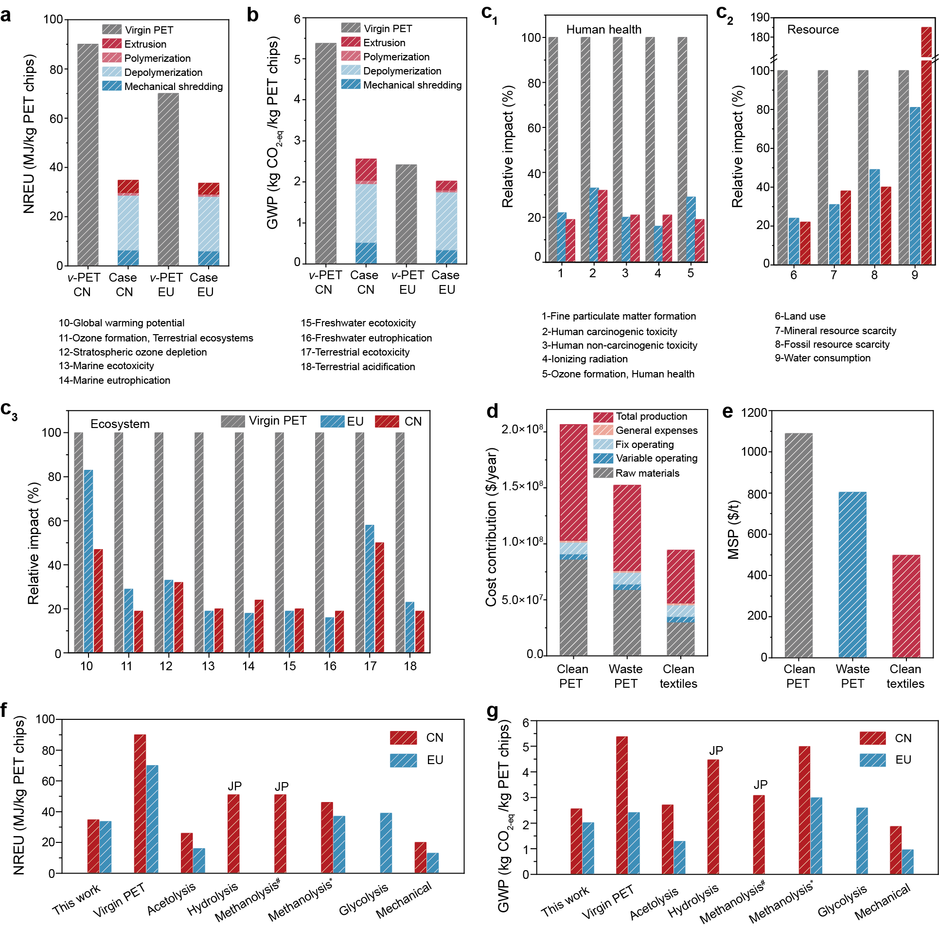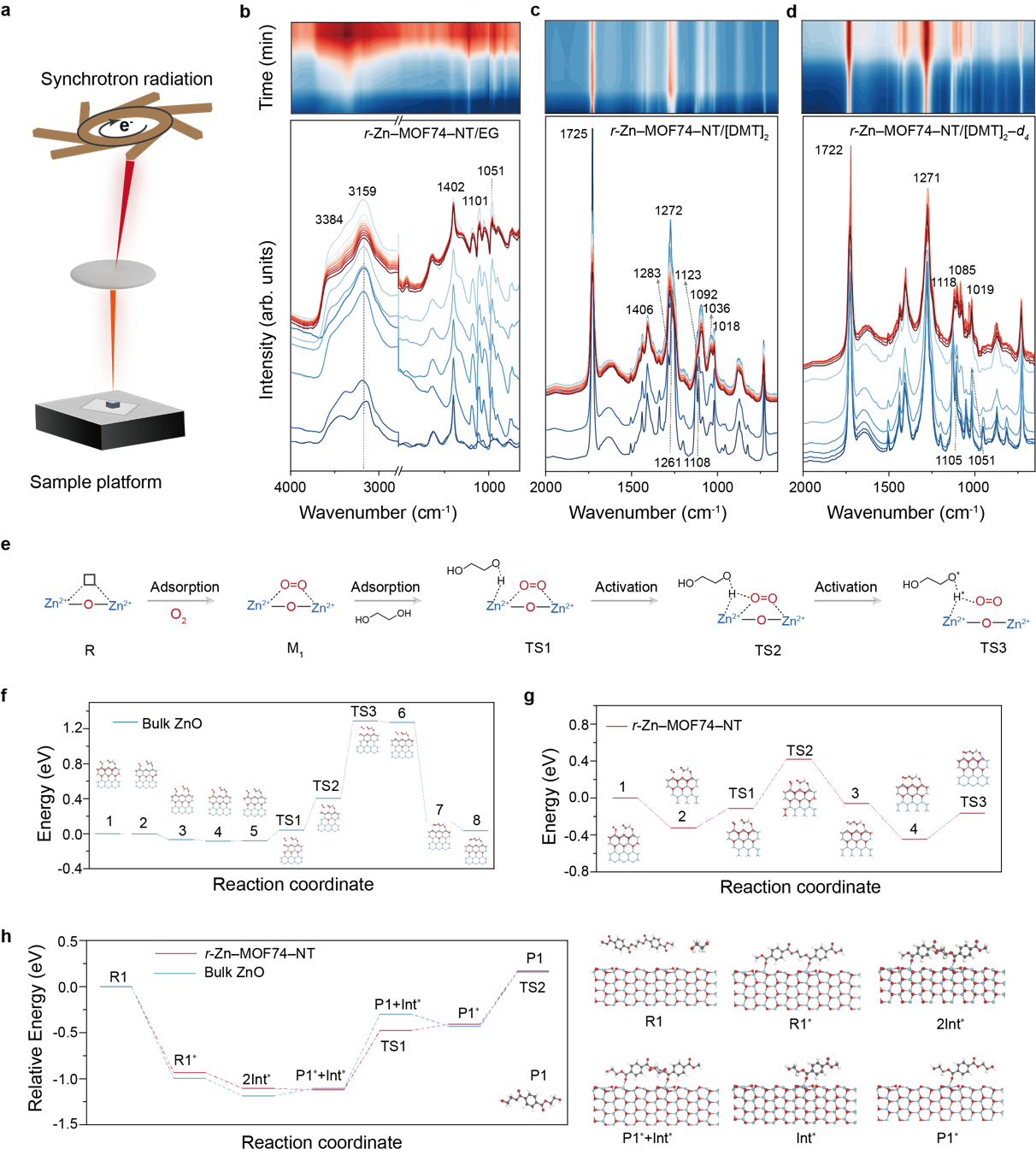 特种防护纺织材料研究所曹静静博士在Angewandte Chemie-International Edition期刊上发表了一篇题为“Sustainable Closed-Loop Recycling of Polyester Waste using Reconstructed Defective-Metal-Organic Frameworks”的研究成果。该研究通过非晶溶解-再结晶结合热解重建策略合成了重构的Zn-MOF74纳米管(r-Zn–MOF74–NT)催化剂。r-Zn–MOF74–NT催化剂在废PET的乙二醇醇解解中实现了1035.8 gBHETgcat−1h−1的时空产率,这比文献中报告的类似催化剂高出一个数量级。结构分析显示,r-Zn–MOF74–NT表面形成了富锌缺陷位点。原位红外结合理论计算,以阐明反应途径,涉及促进氧/乙二醇激活的富锌缺陷催化剂,导致OOH*/HOCH2CH2OH*物种的形成。随后,中间体通过亲核攻击促进聚酯C-O键的裂解,从而逐渐产生BHET产物。此外,还进行了生命周期评估和技术经济分析,将这种乙二醇醇解与甲醇解、水解和石油生产系统进行比较。结果表明,乙二醇醇解提供了重大的环境和经济效益,为废弃聚酯回收的提供理论依据。