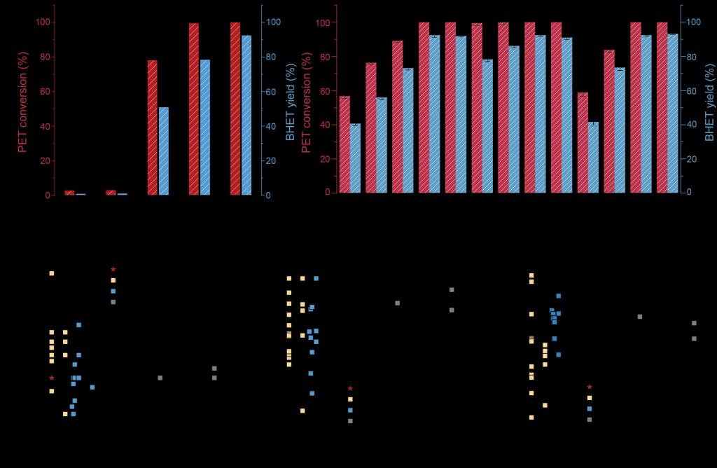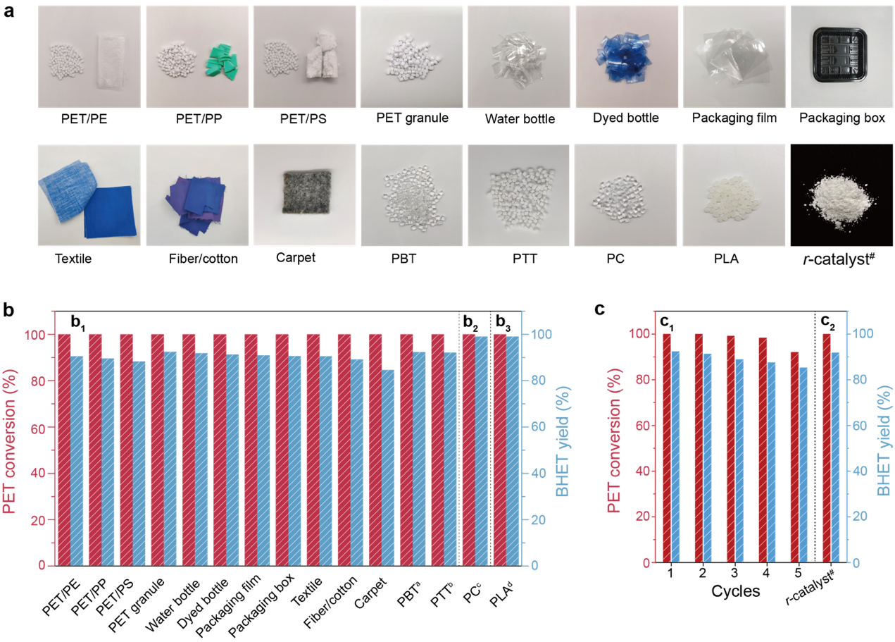 PET聚酯材料广泛应用于人类生产生活(如塑料瓶、纺织品等),年产量已达数千万吨,但PET废弃物的环境危害大且回收难度高,成为了一个亟待解决的全球性难题。聚酯废物可以通过氢化或热催化转化为高价值小分子碳氢化合物,如BTX(苯、甲苯、二甲苯乙烯)、对苯二甲酸、1,4-环己烷二甲醇(CHDM)、1,4-环己烷二甲酸二甲酯(DMCD)和乙烯。然而,在热裂解或氢化过程中,产品选择性难以控制,这通常会导致一系列碳氢化合物产品和甲烷等温室气体。幸运的是,聚酯废物可以通过溶解策略(例如,水解、乙酸解、醇解、氨解)直接转化为单体产品。通过控制酯键的裂解模式,可以提高目标产品的选择性。虽然均相的催化剂可以在相对较低的温度下促进聚酯的完全解聚,但产品选择性仍然有限。异相催化剂需要更高的反应温度才能达到相对较高的产品选择性。因此,迫切需要设计和合成具有稳定性、高选择性和高活性的聚酯解聚催化剂。
