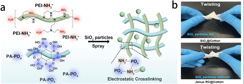 图2 a)静电网络涂层形成机理;b)静电网络涂层对SiO2粒子牢度的影响