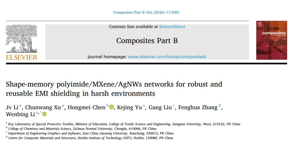先进纤维与纺织复合材料研究团队在复合材料领域顶级期刊《Composites Part B: Engineering》(IF=14.2)上发表题为“Shape-memory polyimide/MXene/AgNWs networks for robust and reusable EMI shielding in harsh environments”的研究论文。该研究提出了一种基于形状记忆聚酰亚胺(PI)的梯度导电网络构建策略,通过将二维MXene和一维银纳米线(AgNWs)组装到静电纺PI纤维基底上,成功制备了具有“静态屏蔽”到“动态适应”转变能力的柔性电磁屏蔽复合薄膜。该研究为开发适用于复杂形变和严苛环境的新一代电子防护材料提供了创新思路。海角社区