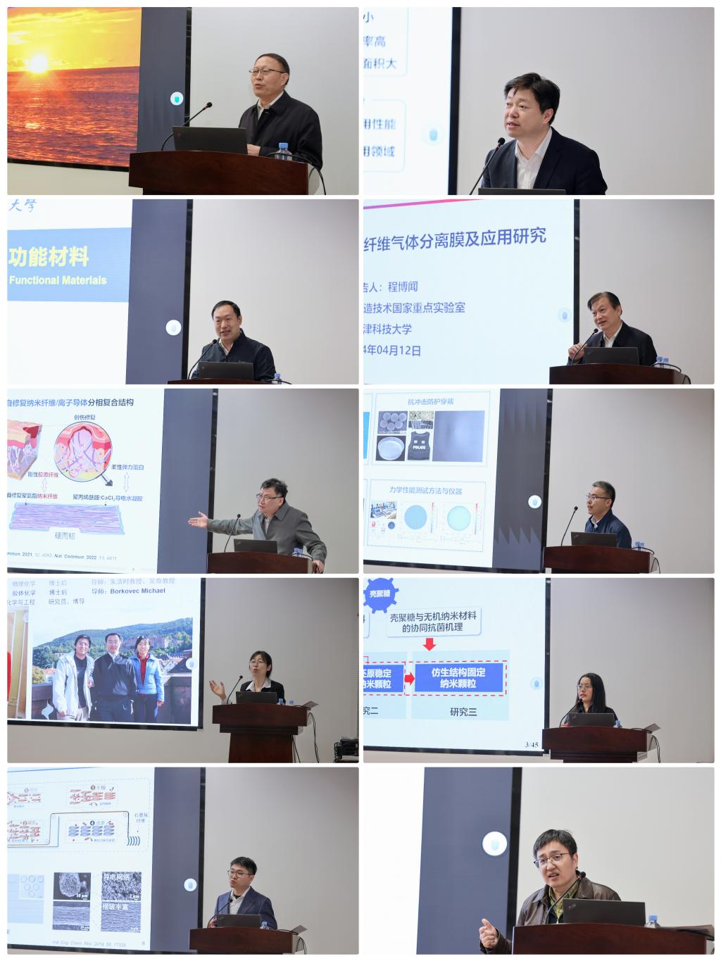 上午论坛包括北京化工大学于中振教授“光热转化复合材料及热能存储利用”、东华大学丁彬教授“防隔热用超细纤维材料”、华东理工大学曲大辉教授“动态化学与功能组装材料”、天津科技大学程博闻教授“高性能聚酰亚胺中空纤维气体分离膜及其应用研究”、东华大学武培怡教授“液滴塑造纤维”、中国科学技术大学宣守虎教授“剪切增稠复合材料与智能防护穿戴”等学术报告,由海角社区 刘天西教授和中科院苏州纳米所张学同教授先后主持。下午论坛包括四川大学林炜教授“生态皮革工业互联网平台建设进展”、华南理工大学王小英教授“壳聚糖复合抗菌材料的绿色构建与应用”、南京工业大学暴宁钟教授“二维材料基纤维的有序构筑及储能应用研究”、中科院苏州纳米所张学同教授“气凝胶纤维设计制备与应用”、东华大学侯成义研究员“传感与交互纤维电子器件”等学术报告,由严锋和于中振先后主持。