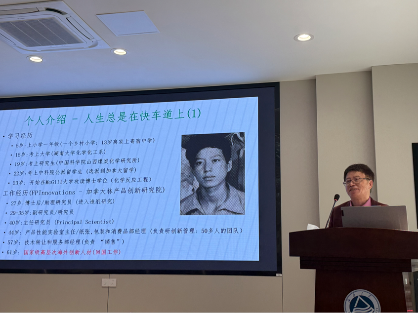 专业分享之余,邹学军博士以“人生总是在快车道上”为题,讲述了自己从年少求学、海外深造到归国深耕制浆造纸领域的数十年历程,也分享了家人在各自领域深耕成长的故事,其家庭的奋进与多元发展特质令人触动。互动环节中,邹学军博士解答了专业选择、职业发展、家庭与工作平衡等问题,强调专业学习重基础、职业发展需终身学习,秉持“家庭第一”的平衡原则。他寄语年轻人心怀梦想、勤奋感恩、兼具国际视野,做到“追求优秀,而不是完美”。此次学术报告为与会师生剖析了行业未来发展方向,传递了勇于探索、持续奋进、平衡兼顾的人生态度,尤其为学生的专业研究、职业规划与人生发展提供了宝贵启示。