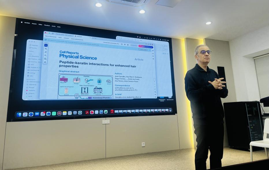报告中,Artur教授回顾了自己的研究脉络。他说道:“我的研究最早是从羊毛开始的,后来发现头发和羊毛都是蛋白质纤维,结构非常相似,所以很自然地把纺织加工中积累的经验迁移到了头发护理研究上。”从纺织纤维到头发护理、从传统染整到健康护理产品研发,这一学术路径的演变,生动体现了纺织学科在生物基材料与生命健康交叉领域的广阔延伸空间。