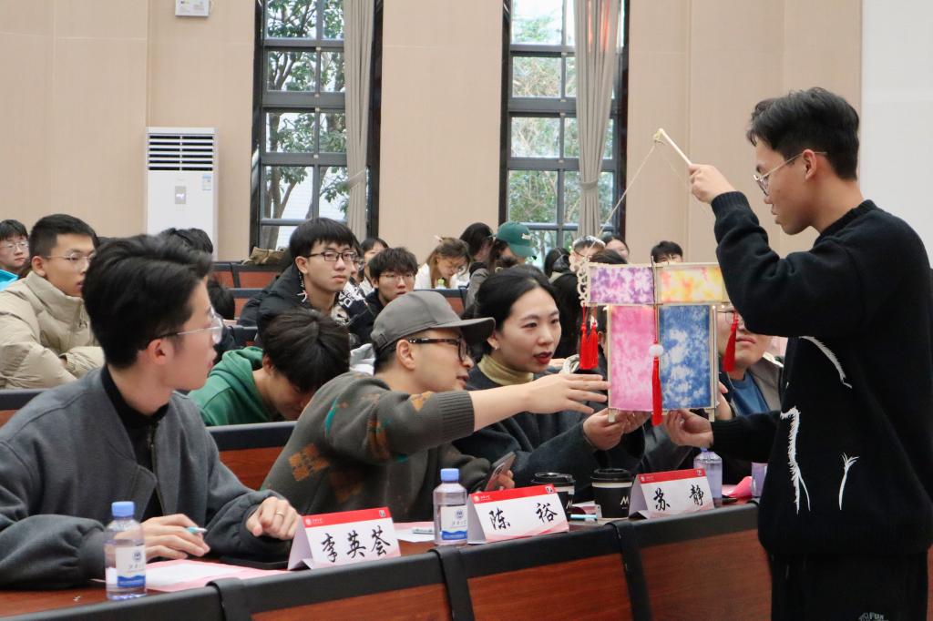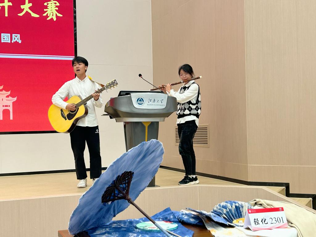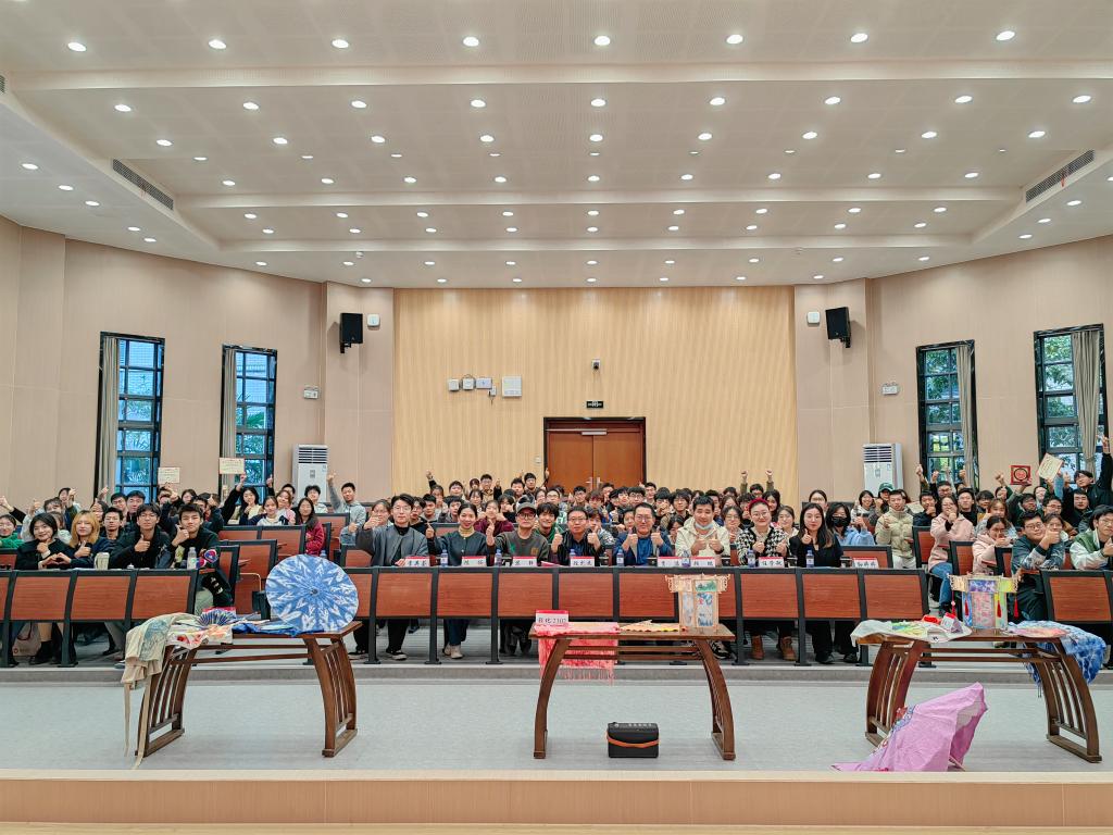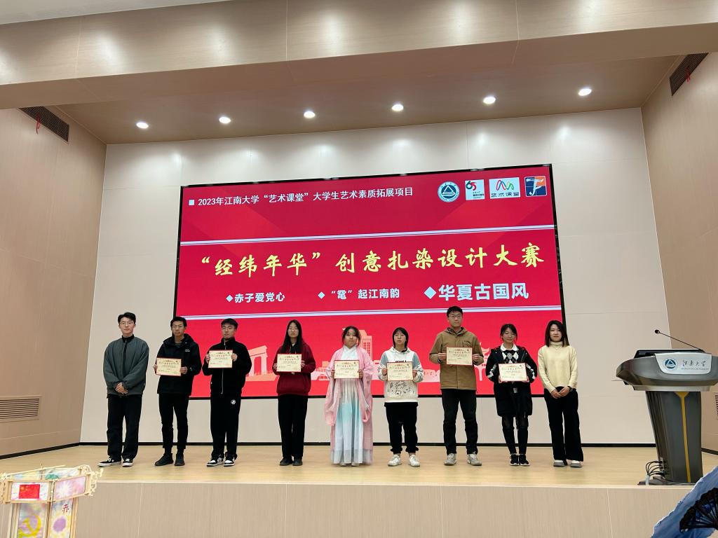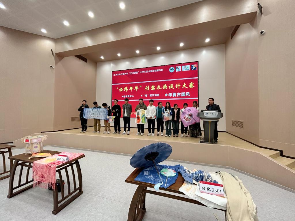 在科学技术和商品经济高速发展的今天,扎染作为一种独具特色的手工染色技艺,因其独特的装饰趣味和艺术感染力,仍然具有强大的生命力。同学们的创作与分享,将传统工艺与现代创意进行碰撞,绽放出扎染的独特艺术魅力,也展现出江南纺织学子敢于创新的精神风貌与爱党爱国的深厚情怀。比赛中还穿插同学们歌曲弹唱,嘉宾老师为获奖团队颁奖,并对获奖同学表示祝贺。