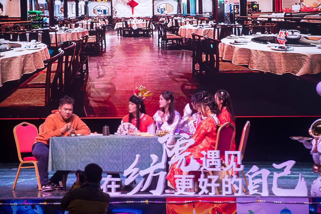 第一篇章“造梦”中,校艺术团舞蹈部WDB舞团的《Nice to meet ya》,流畅张扬的舞蹈刻画着青春与活力,铿锵强力的音乐声与其美妙融合;纺织2203班的“刘姥姥”在《大观园新编》中带着红楼梦的人物和观众们共同感受古韵文化与现代文化的相互碰撞;轻化2201班的舞台剧《说戏》,白雪公主与哪吒相遇,青蛇白蛇掉入了葫芦七娃的包围之中,妙趣横生;纺织2201班的《甄嬛传》配音节目中,穿越到古代谈论学习,引发观众强烈共鸣;汉服社带来舞蹈《绝世舞姬》,唯美汉服中国风。