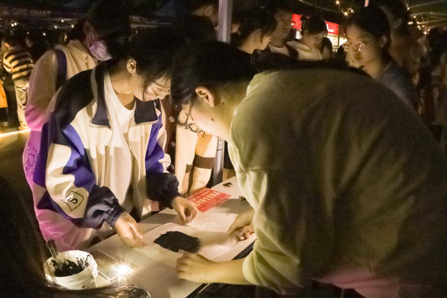迎新文化节主要开设十个活动摊位,分别为心愿祈福、你捏我猜、贴贴壶、挤眉弄眼吃饼干、盲盒猜古诗、奖品发放、丝网印花特色体验、纸鸢社川崎玫瑰制作、汉风社投壶比赛和创意扎染设计大赛优秀作品展。同学们被别具匠心的特色活动深深吸引,纷纷驻足观赏、体验、互动。心愿祈福中,有师生写下对未来的期许,也有师生表达对家人朋友的美好祝愿……;盲盒猜古诗活动中,大家在欢乐愉快的氛围中展示自己的文化底蕴,同时继续收获新的文化知识;你捏我猜和贴贴壶活动中,每个人都开动思维、显示技巧,依靠自己的双手来传递力量;挤眉弄眼吃饼干游戏中,同学们在一片欢声笑语中收获满足与快乐。