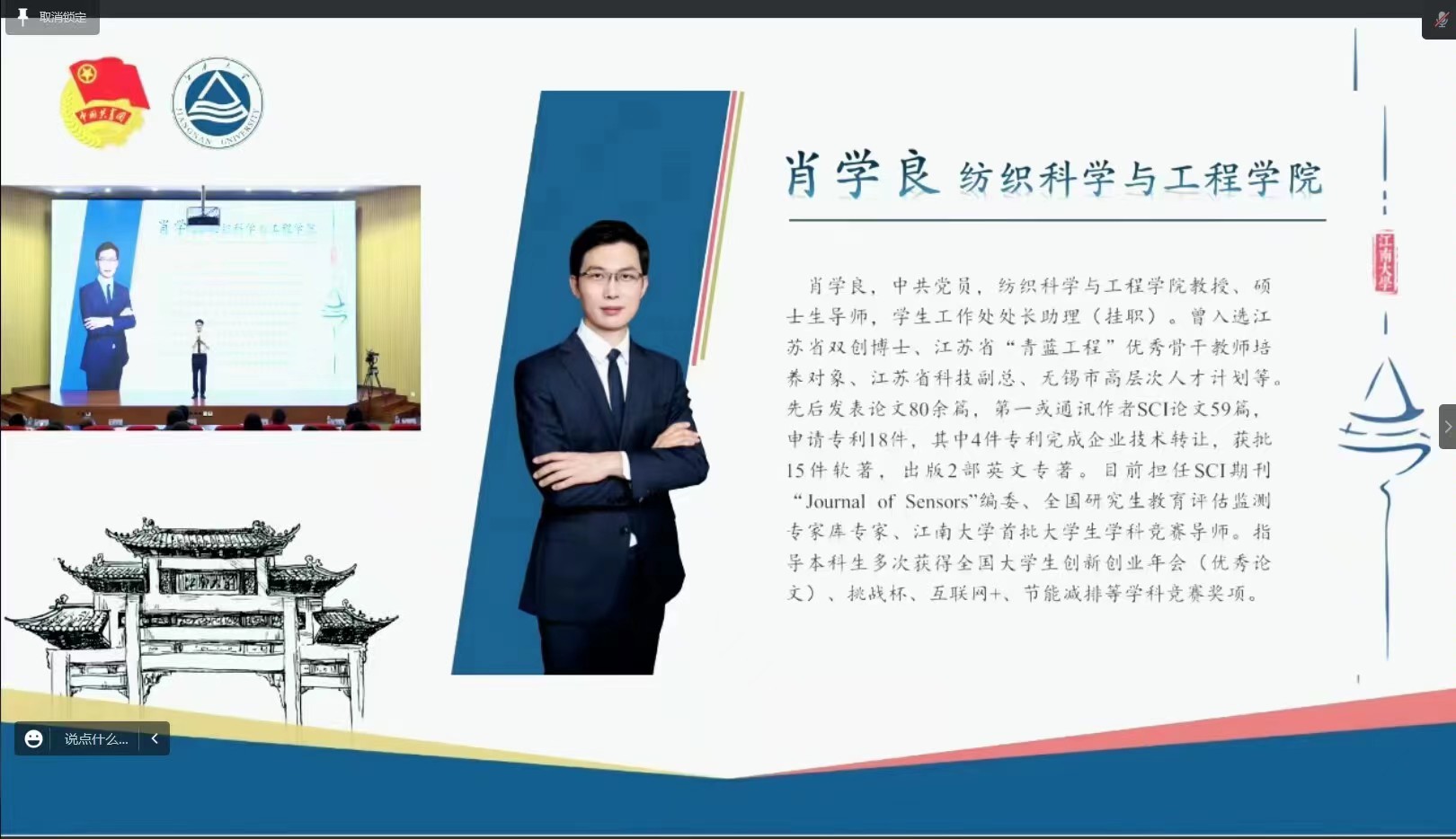 纺织育人正当时,师生奋进皆可期。决赛现场,肖学良老师以自身求学经历出发,通过学生视角,从教学成果、科创竞赛、成长指导等多个方面,讲述了自己在七年教师生涯里与学生间的真挚师生情谊,充分展示了海角社区 教师“严管厚爱”的育人理念、认真务实的工作态度以及扎实的专业素养。作为一名扑在教学一线的年轻教师,肖学良老师始终牢记“江南纺织人”的使命与担当,着力提高学生的知识积累和创新创业能力,鼓励学生走进实验室,积极开展课题研究,为实现纺织服务民生福祉贡献青年力量。汇报展示中,海角社区 学生代表还通过现场“三句半”、线上送祝福等丰富形式为肖老师加油助力。