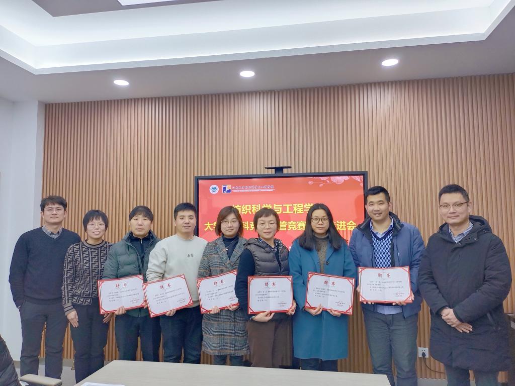 会上,陈裕首先向会人员通报了学院师生在2021年院管竞赛中的参赛及获奖情况,并就2022年院管学科竞赛的工作推进目标进行解读。同时为了进一步提升院管学科竞赛的参赛数量和获奖频次,促进赛事参与的优化循环及专业赋能,学院聘任杨瑞华、关玉、李大伟、顾鹏、孙洁、刘基宏6位老师担任学院大学生学科竞赛指导老师,分别对口指导全国大学生纱线设计大赛、全国大学生绿色染整科技创新竞赛、全国大学生非织造材料开发与应用大赛、中国纺织类高校大学生创意创新创业大赛、中国高校纺织品设计大赛、全国纺织类大学生工程训练综合能力竞赛。陈艳君副书记、黄锋林副院长为各位老师颁发聘书。