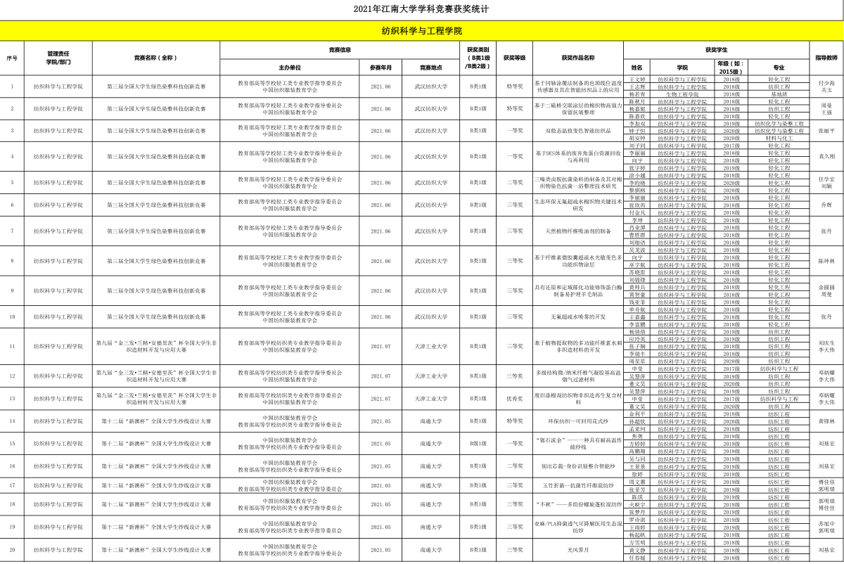 学子共获奖7项,其中特等奖1项、一等奖1项、二等奖1项、三等奖4项;由黄锋林老师指导,纺织1801班金利平同学负责的科创作品《环保纺织—可回用花式纱》荣获全国特等奖。在第三届全国大学生绿色染整科技创新竞赛中,海角社区
