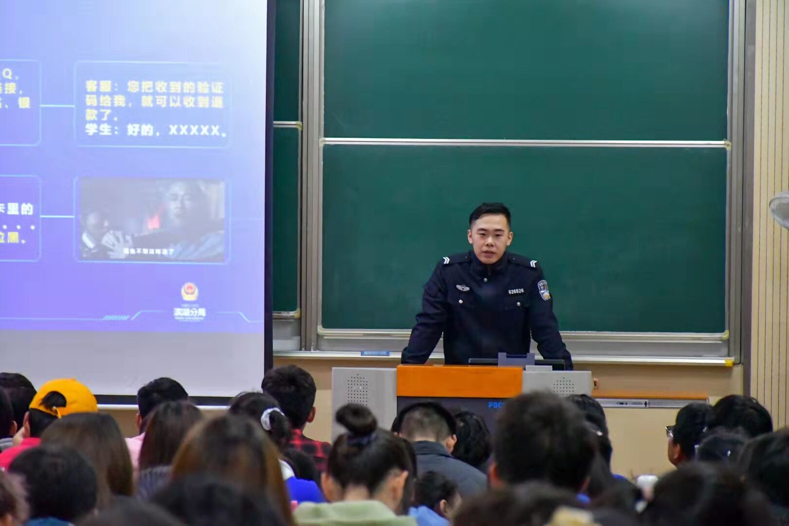 刘啸从电信网络诈骗定义、形势特点、常见类型、如何防范、补救措施五个方面向同学们展开科普教育。他指出,网络诈骗案件具有:非接触性、犯罪成本低且经济收入高、侵害对象广社会危害大、犯罪团伙化且分工精细、犯罪区域化、服务产业化等特点,主要包括冒充、刷单、网络贷款、红包返利、交友赌博(杀猪盘)、钓鱼诈骗等类型。接下来,刘啸又以同学们身边的真实案例为大家展示了骗局背后的真相,让大家了解到骗局的形成过程,提高大家对类似事件的警惕性。刘啸还提醒大家,在遇到网络诈骗时应当做到不慌张、不轻信、不转账。