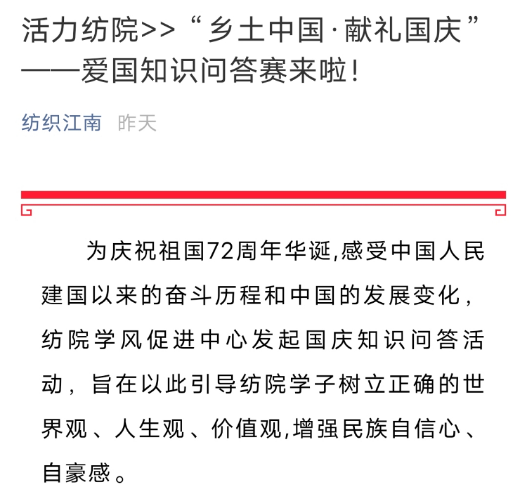 在全体学生中开展“乡土中国·献礼国庆”——爱国知识问答赛活动,活动由学院学风促进中心组织发起。爱国主义教育,是校园、课堂不可或缺的重要内容,是倡导同学们知行合一、身体力行,把对国家之爱融入日常付诸行动的重要途径。活动吸引了广大纺院学子参加比赛,问答题目内容涉及时政、文学、历史、地理等多方面的内容。比赛旨在让广大学生感受中国人民建国以来的奋斗历程和新中国的发展变化,引导同学们树立正确的世界观、人生观、价值观,增强民族自信心、自豪感。