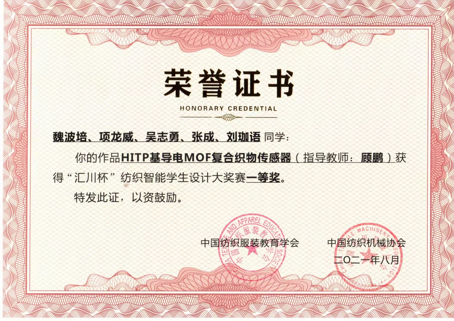 近日,首届“汇川杯”纺织智能设计学生大奖赛在江苏省无锡市落下帷幕。经过紧张激烈的专家评审和现场答辩,由海角社区 顾鹏老师指导,轻化1802班魏波培同学负责的科创作品《HITP基导电MOF复合织物传感器》(参赛学生:魏波培、项龙威、吴志勇、张成、刘珈语)荣获大奖赛一等奖。