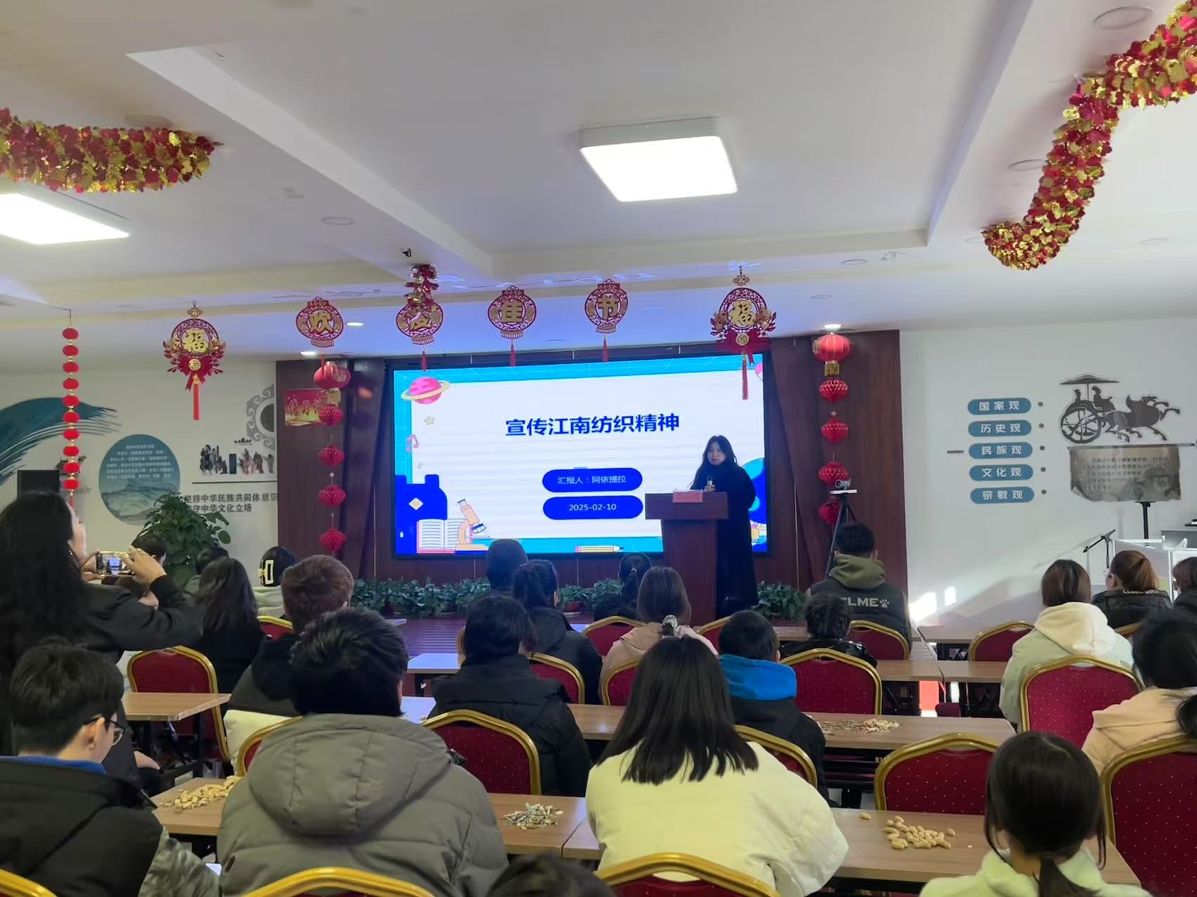 在深深了解到江南纺织精神的深刻内涵后,阿依提拉同学奔赴家乡的社区,在新疆库尔勒市朝阳街道团结社区里,通过精心制作的PPT,向居民们宣传江南纺织知识的内涵和江南纺织产品的特色与优势。她强调,江南纺织精神代表着匠心独运、精益求精和不断创新,是中华民族优秀传统文化的重要组成部分。