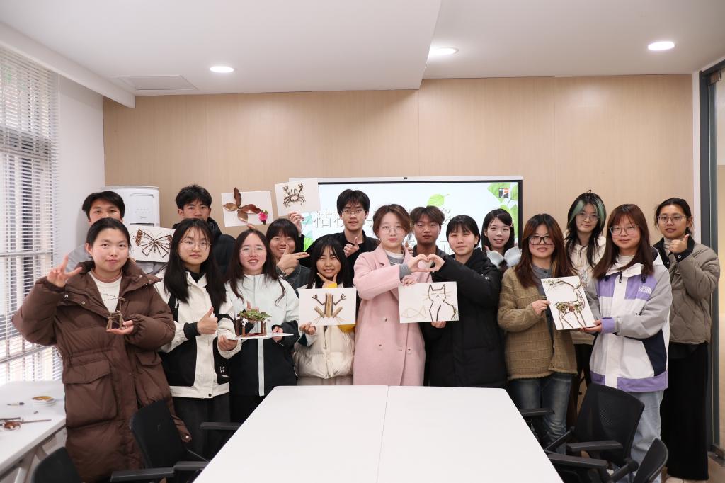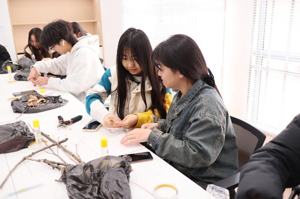清扫后,同学们前往北区一站式活动中心,将筛选过后的枝条叶片进行二次创作。通过拼贴组合等方法,加以纺织学子的创意思维,废弃破败的枯枝便化身为一件件精美鲜活的手工艺品,栩栩如生、充满生机。同学们纷纷表示:“当我们俯身捡拾枯枝落叶时,感受到了生命轮回的温度;而当我们找寻其中‘破败的美’,使它们重获新生,这便是‘可持续发展’的真谛,也让我们深入理解了植树节和习近平生态文明思想的意义。”
