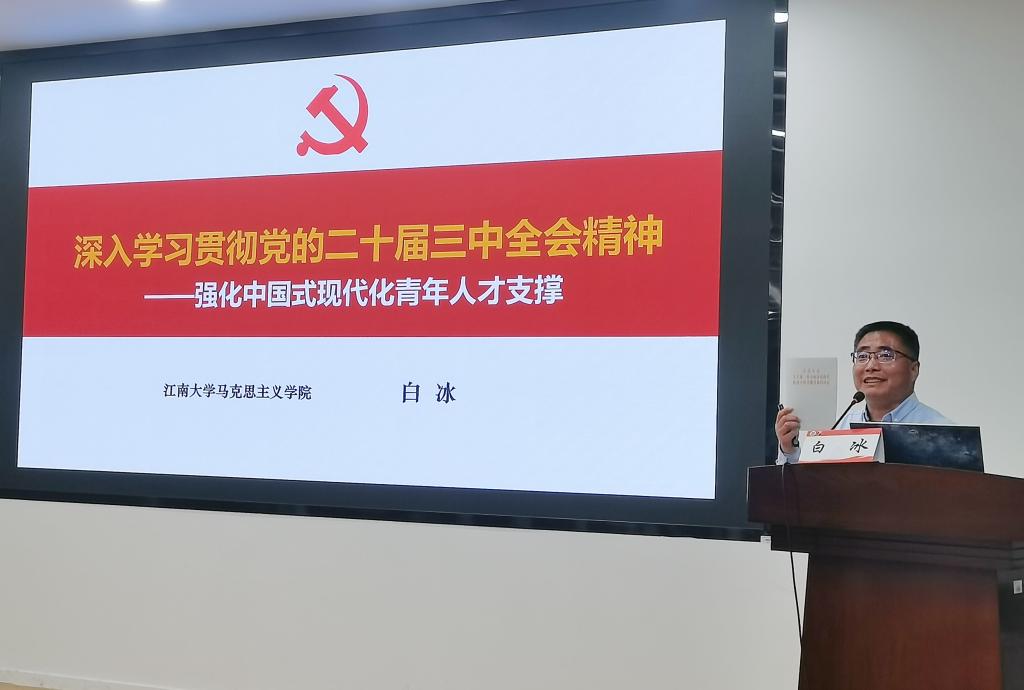 白冰讲授《深入学习贯彻党的二十届三中全会精神,强化中国式现代化青年人才支撑》主题课程,他立足党的二十大以来党中央治国理政新理念新战略,聚焦“教育、科技、人才”三位一体战略部署,深入分析了新时代青年在科技创新、产业升级、文化传承等领域肩负的责任。他强调,青年学子要深刻领会党的创新理论,立足专业特色,以纺织学科服务国家重大需求,在推进新型工业化、发展新质生产力中贡献青春力量。