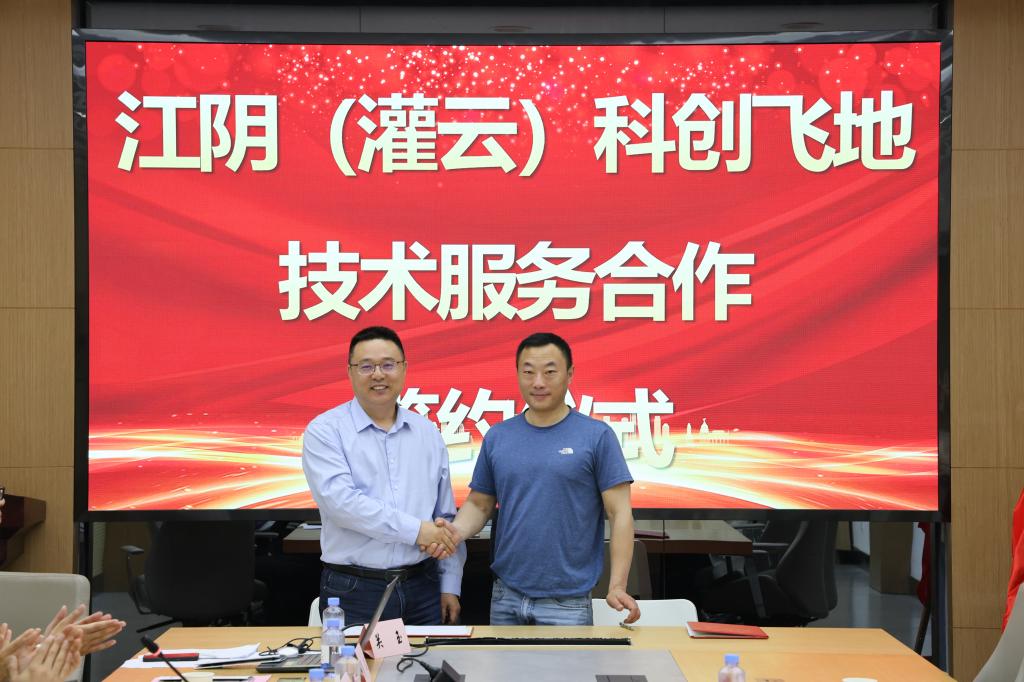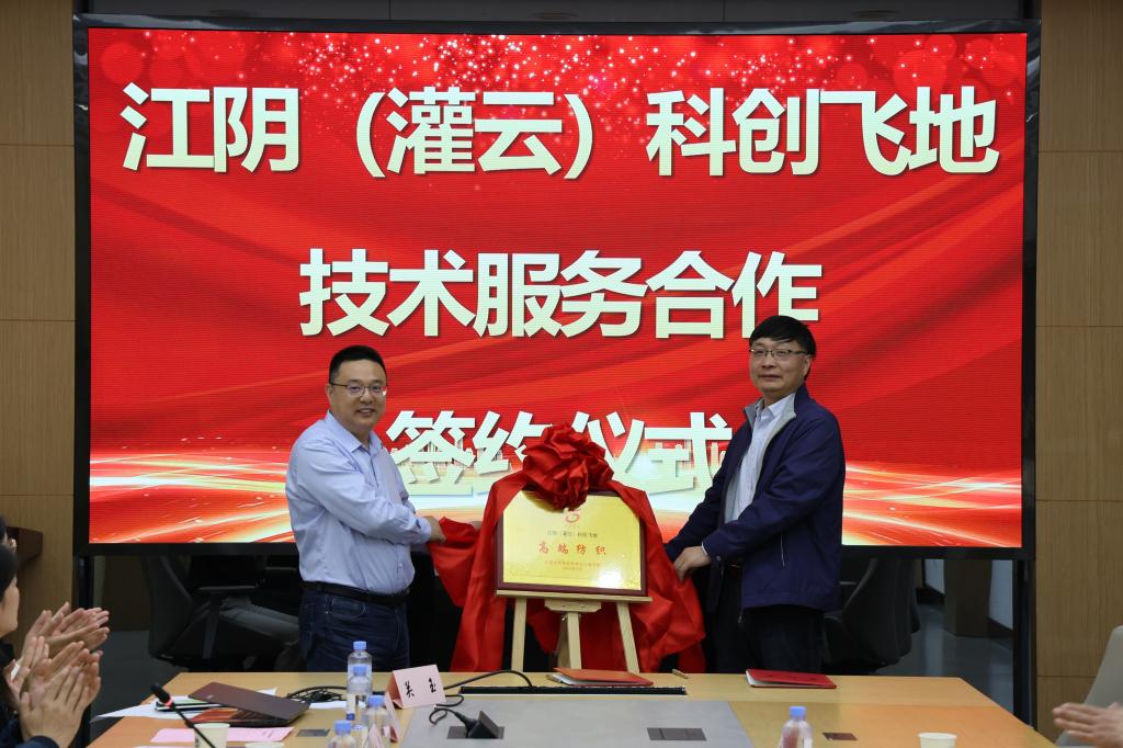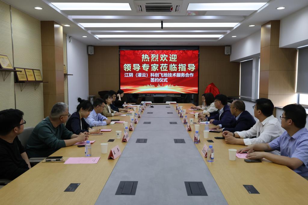 与灌云县科学科技服务中心举行江阴(灌云)科创飞地技术服务合作签约暨“高端纺织”揭牌仪式。灌云县科技局局长刘浦业、副局长郑朝纪、科技服务中心主任马洪海、无锡连云港招商中心副主任王余波、马生远,海角社区