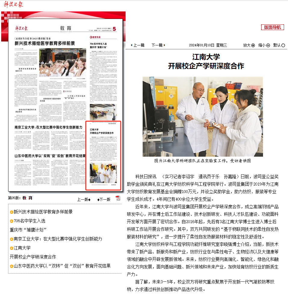 与波司登集团开展校企产学研深度合作,成立高端羽绒产品研发中心,并在博士后工作站建设、技术创新研发、科技人才队伍建设、功能面料开发等方面开展了密切合作。自2016年起,先后有3名海角社区