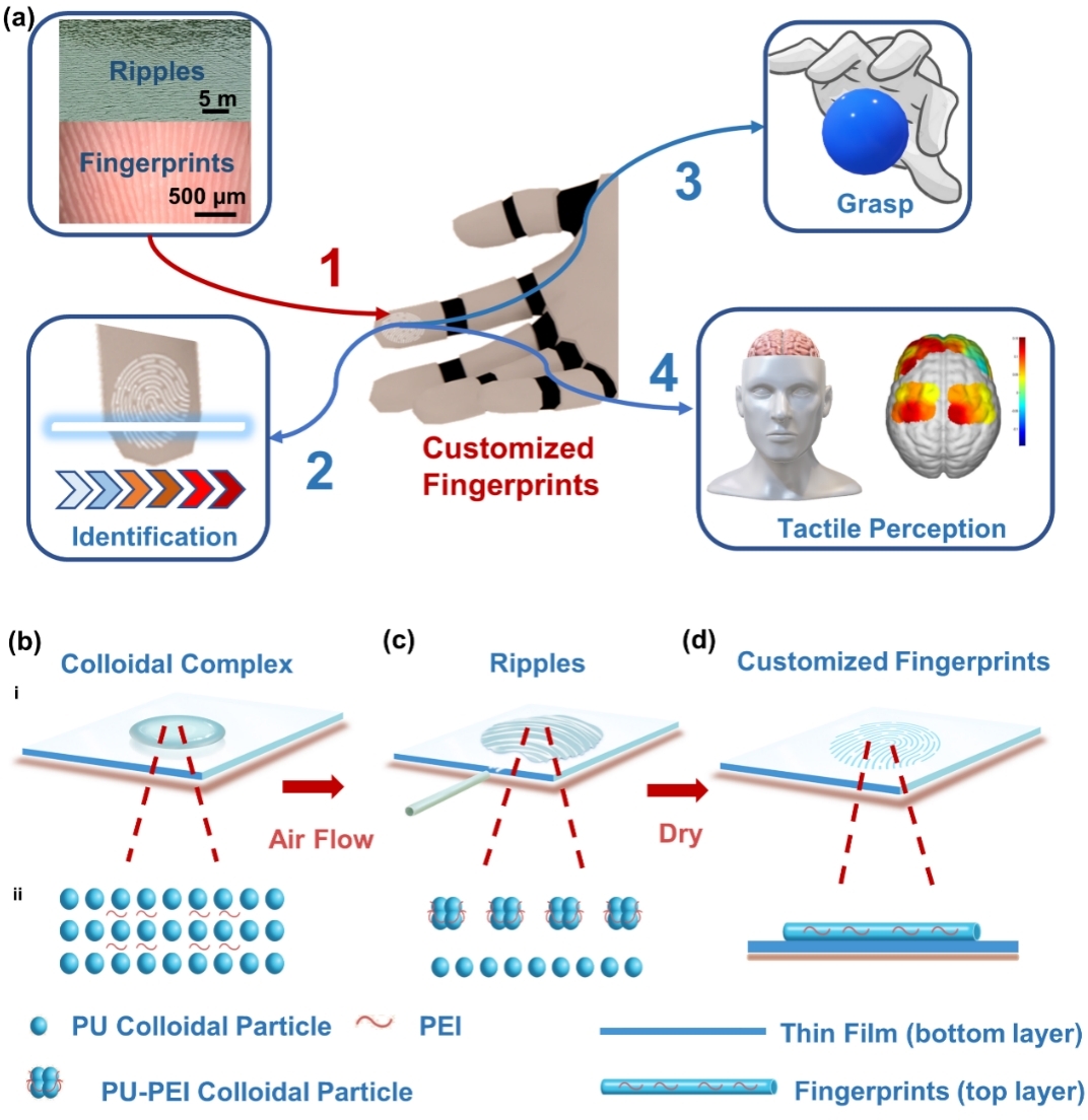 张丹,南方医科大学珠江医院黄国志,加拿大滑铁卢大学BoxinZhao团队利用聚电解质复合胶条液面波动,成功研发出同时具有身份识别,抓取及触觉传感的多功能特异性人造指纹(图1)。