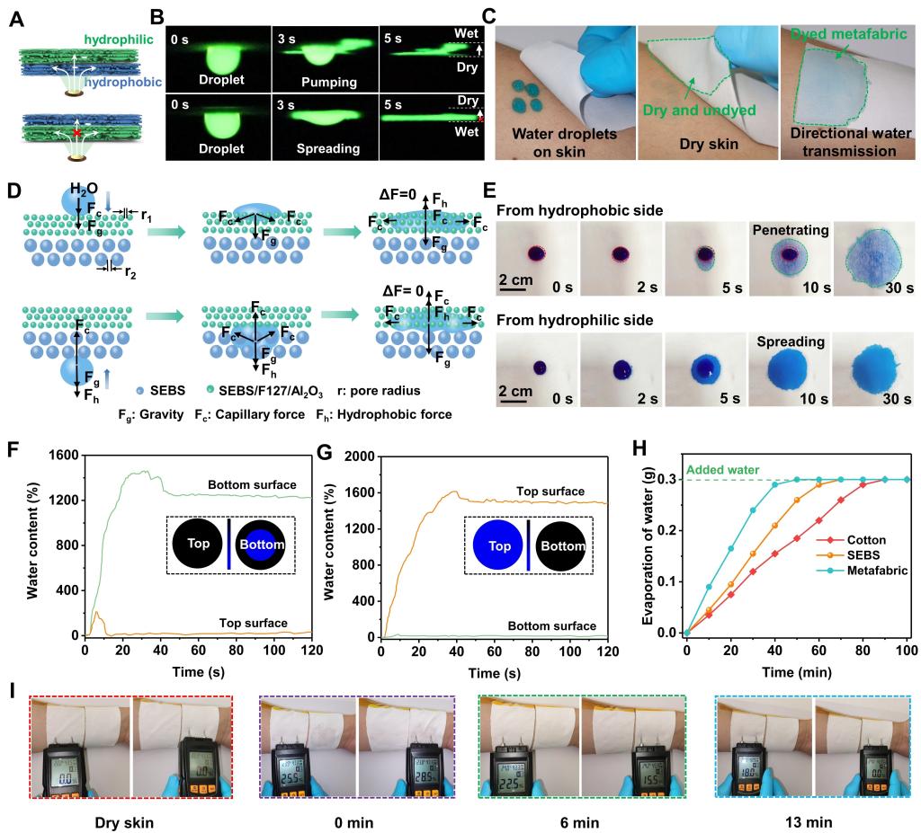 魏取福教授、吕鹏飞研究员提出了一种具有单向导湿的非织造布超织物,结合了辐射冷却和蒸发散热,以实现高性能的个人热、湿管理。这种超织物通过大规模静电纺丝和分层结构设计表现出优异的光谱选择性(太阳光反射率≈92%,大气窗口热发射率≈97%)和Janus润湿性,并且还具有优异的弹性、透气/透湿性。可实现低于环境温度约6.5 °C的降温性能和快速的吸湿排汗作用(水分蒸发率为0.31 g h-1,水分传输指数为1220%)。此外,可以通过施加各种应变(0-100%)来调节超织物的冷却性能。超织物的成本效益和良好的可穿戴性为可持续能源、智能纺织品和热湿舒适应用提供了一种普适策略。以上研究成果近期以“Dynamically Tunable Subambient Daytime Radiative Cooling Metafabric with Janus Wettability”为题,发表在国际权威期刊《Advanced Functional Materials》上。海角社区