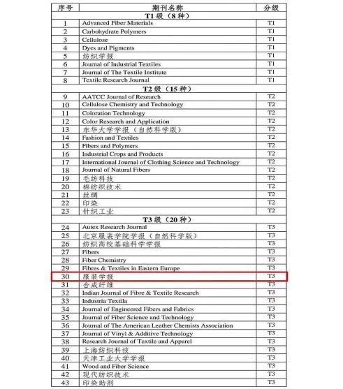 《纺织领域高质量科技期刊分级目录(2022版)》由中国纺织工程学会组织认定与发布,国内外共43种期刊进入分级目录(2022版),其中T1级别8种,T2级别15种,T3级别20种。高质量科技期刊T1级表示已经接近或具备国际一流期刊,T2级是指国际知名期刊,T3级指业内认可的较高水平期刊。《服装学报》位列纺织领域高质量科技期刊T3级别。
