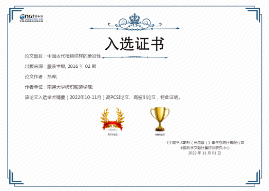 2022年10月,中国知网《学术精要数据库》发布近12年(2011—2022年)高影响力论文。按论文引证标准化指数(paper citation standardized index,PCSI)、被引频次和下载频次遴选出学科前1%的论文即为高PCSI论文、高被引论文及高下载论文。《服装学报》共61篇论文入选中国知网《学术精要数据库》,其中,高被引论文2篇,高下载论文4篇,高PCSI论文5篇。