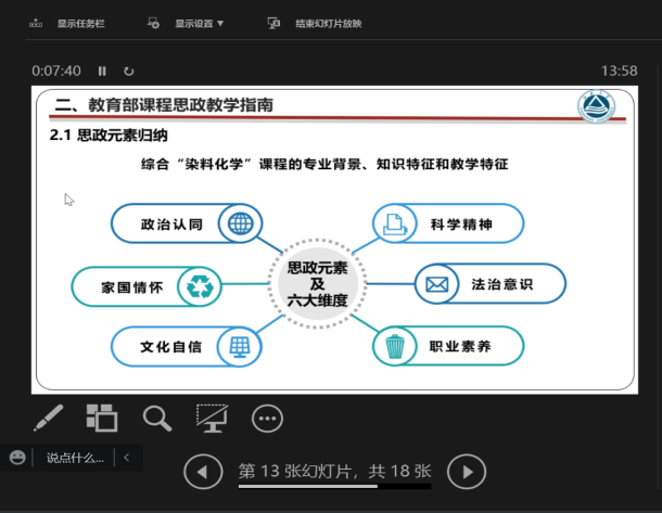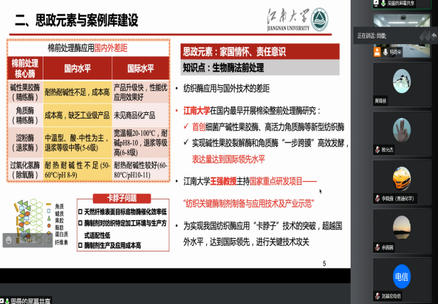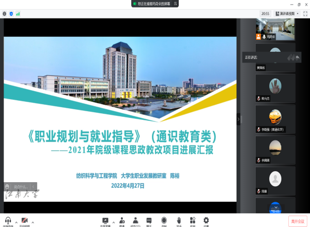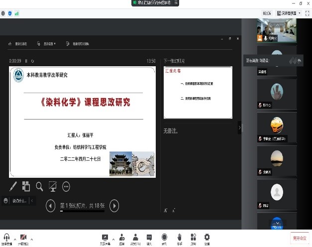 2项校级课程思政示范课程“纺纱工程”和“染料化学”先进汇报了建设情况,并就项目建设实施的过程,结合兄弟高校的建设成效分享了思考和心得,提出了后续工作的建设目标和方向。随后14项院级项目负责人从课程思政教学大纲的制定,案例库搜集建立的维度,以及示范课视频讲授的重点,课程思政研究的理论成果等方面进行了汇报和交流,参会人员还对教改项目的下一步推进,学院课程思政案例资源的整合党方面展开热烈讨论,进一步明确了各课程项目今后研究内容。