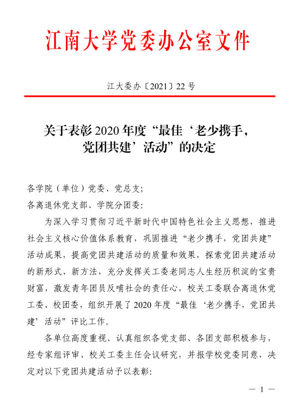 报送的两项活动均获表彰。其中青山退休第六党支部与纺织1901团支部组织申报的活动荣获“最佳党团共建活动”(全校共七项),梅园退休党支部与纺织2003班团支部组织申报的活动荣获“优秀党团共建活动”。