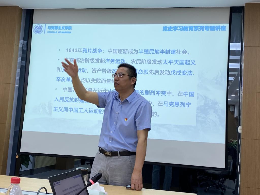 马克思主义学院的陈绪新教授为党支部全体党员带来了题为“中国共产党百年辉煌的奋斗进程机器历史经验”的精彩报告。陈教授深入浅出,从1921-2021年中国共产党走过的整整100年历程中选取关键转折点展开,系统回顾了百年来党团结带领人民走过的光辉历程、取得的辉煌成就,重点回顾了党的十八大以来党内专题学习教育活动,深刻阐述了开展党史学习教育的重大意义。陈教授对党的历史发展思考深、视角新,语言生动活泼,激发了在场党员的思想共鸣。