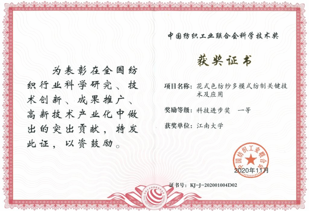蒋高明教授团队“经编短纤紗生产关键技术研究与产业化”荣获科技进步一等奖(第一单位);高卫东教授团队“花式色纺纱多模式纺制关键技术及应用” 获科技进步一等奖 (第二单位);付少海教授团队“纳米颜料制备及原液着色湿法纺丝关键技术” 获科技进步一等奖 (第二单位);王强教授团队“功能性易护理羊毛织物的生物法制备关键技术及应用”获中国纺织工业联合会科学技术发明奖二等奖(第一单位);王潮霞教授团队“纺织品清洁化生产用夜状分散染料开发及其产业化应用”获科技进步二等奖 (第一单位);王春霞老师参与的“精油微胶囊的设计、制备及其在纺织品功能整理中的应用”获中国纺织工业联合会科学技术发明奖二等奖(第二单位);卢雨正副教授参与的“喷气涡流纺高支高混比汉麻家纺面料生产关键技术及应用”获科技进步二等奖(第二单位);袁久刚副教授参与的“无甲醛免烫整理剂的研制及高品质免烫全棉面料的开发”获科技进步奖二等奖(第二单位)。此外,我校蒋高明教授团队“针织全成形运动休闲内衣的设计与开发”获评“纺织之光”2020年度中国纺织工业联合会针织内衣创新贡献奖。张丽平副教授获“纺织之光”2020年度教师奖;关玉、王静安等五名同学荣获“纺织之光”2020年度学生奖。