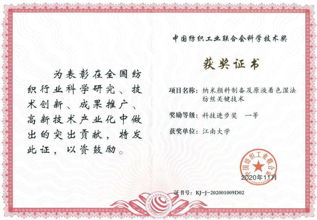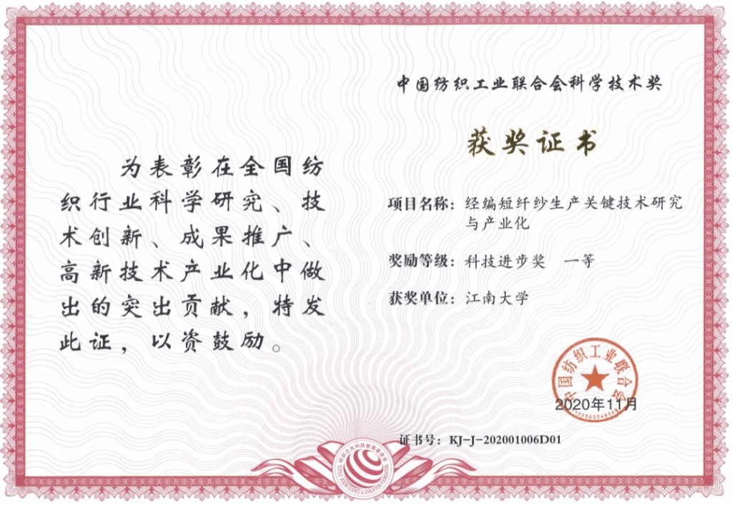 2020年12月22日, “纺织之光”中国纺织工业联合会科技教育奖励大会、中国纺织创新年会、中国纺织企业家年会、中国纺织服装行业社会责任年会、中国纺联第四届第五次理事会暨四届八次常务理事扩大会议等“五会合一”大会在山西太原隆重召开。大会对为我国纺织科技、教育、产业发展做出突出贡献的学界、行业精英进行了表彰,颁发了2020年度中国纺织工业联合会科学技术发明奖、科学技术进步奖、特别贡献奖(桑麻学者)、教育教学成果奖、“纺织之光”教师奖和学生特别奖等奖项。