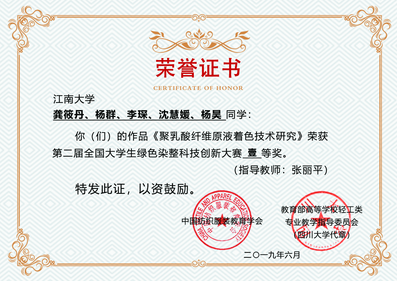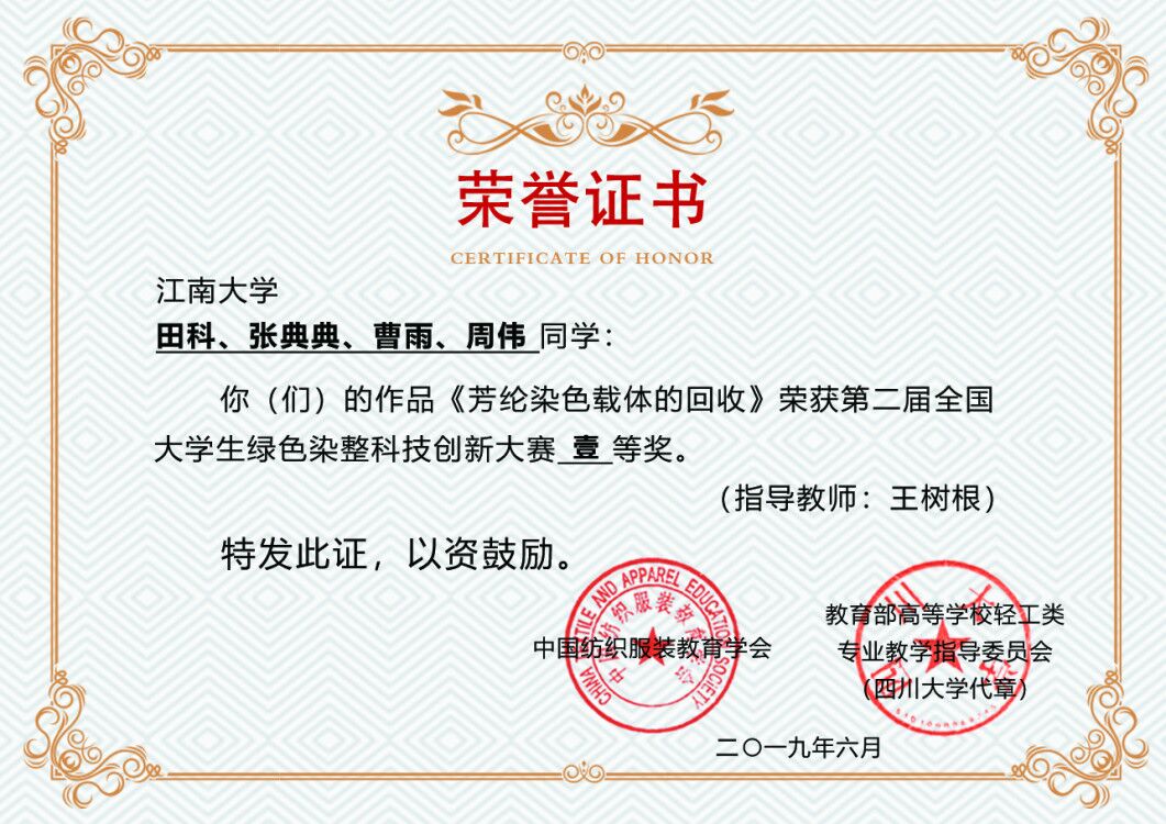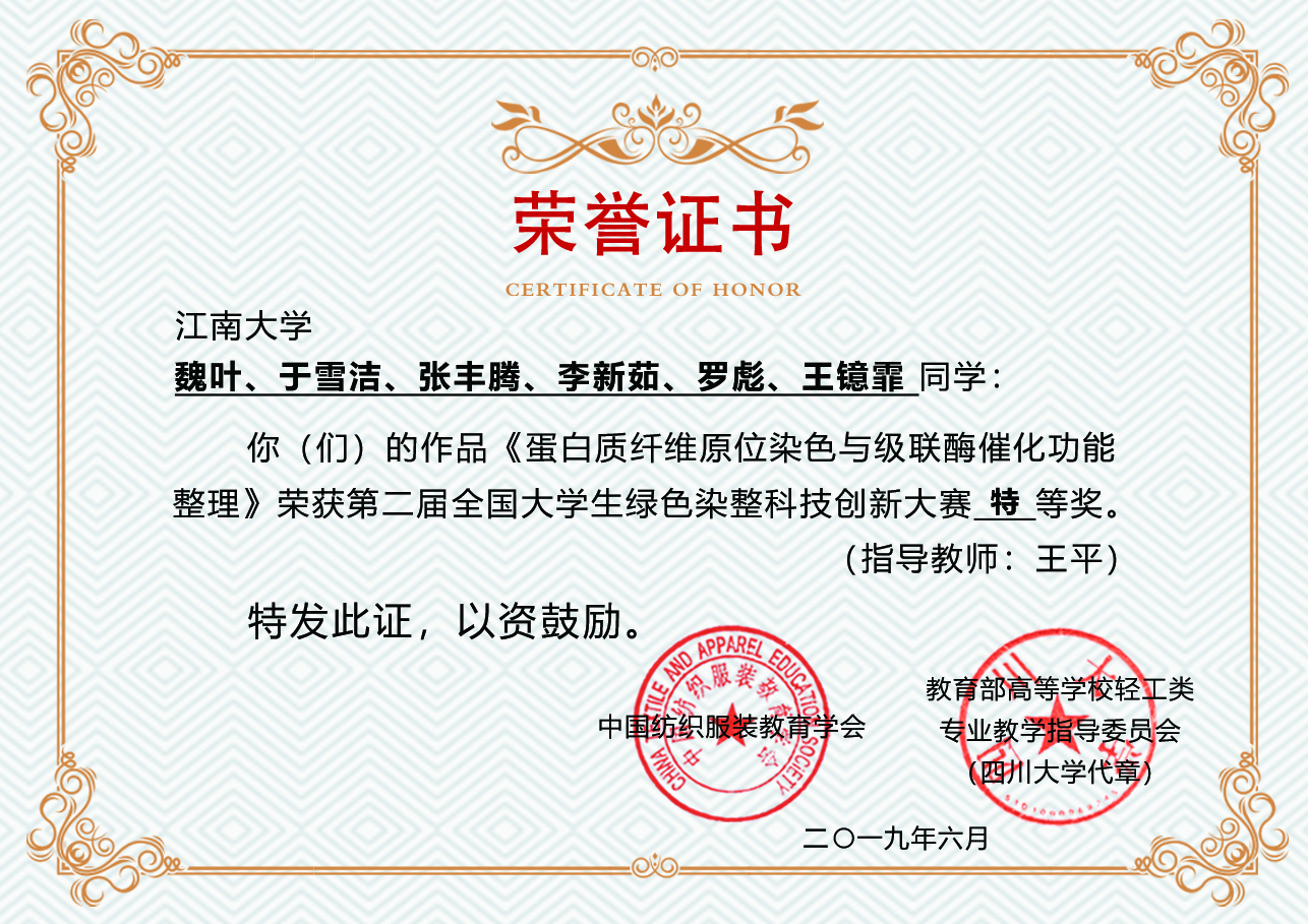 纺织服装学院共5项作品参评,由王平老师指导的项目《蛋白质纤维原位染色与级联酶催化功能整理》(学生负责人魏叶)荣获特等奖;由张丽平老师指导的项目《聚乳酸纤维原液着色技术研究》(学生负责人龚筱丹)和由王树根老师指导的项目《芳纶染色载体的回收》(学生负责人田科)荣获一等奖;由任学宏、刘颖老师指导的项目《一种抗菌/油水分离纳晶纤维素气凝胶的制备与应用》(学生负责人张艳)荣获二等奖;由袁久刚老师指导的项目《基于DES体系的羊毛低温染色及防缩加工技术》(学生负责人张依依)荣获三等奖。