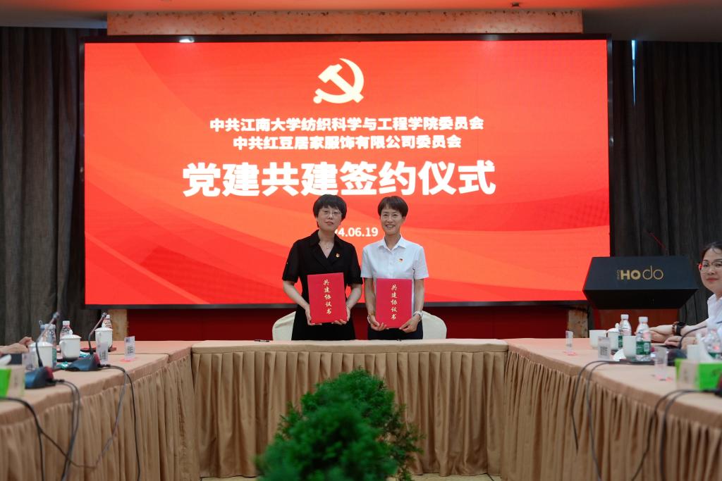 张菁燕、钱静分别代表学院党委、红豆居家党委签订党建共建协议书。今后,双方将在组织建设互促、党员干部互动、党建载体互用、双向赋能互助等方面展开深入合作。与会人员围绕基层党组织建设、海角社区建设、纺织精神传承、产学研工作等进行了交流讨论。