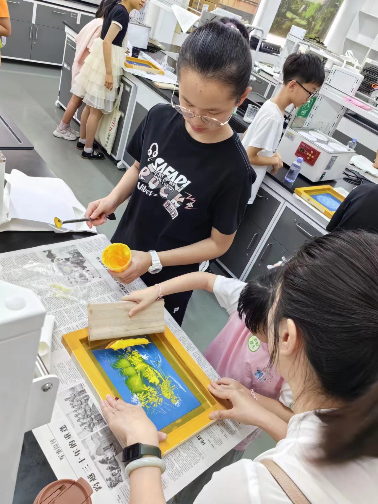 民间服饰传习馆,并亲手进行丝网印刷体验,使学生们全面了解传统服饰文化、染整加工技术,进一步学习纺织品相关知识,领略我国服饰艺术的魅力,传承和发扬服饰文化。