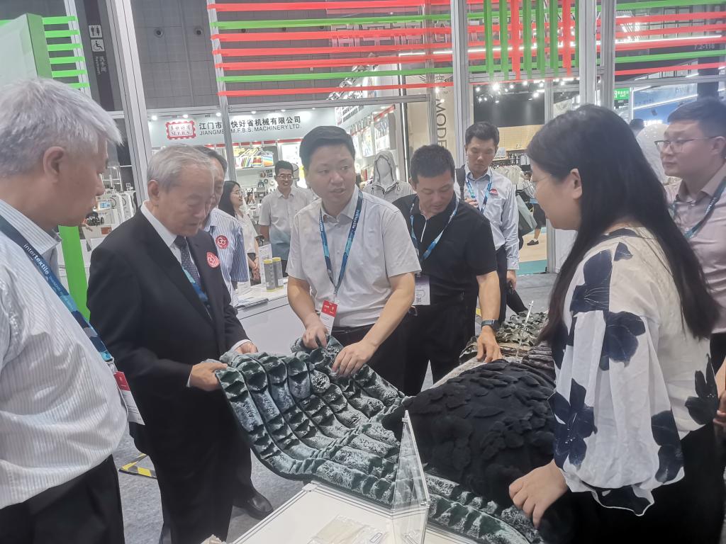 学院展品包括温感变色纺织品、“闪染”织物、高耐候“三防”户外面料等。其中,温感变色纺织品是一类根据环境温度而发生颜色变化的功能纺织材料,通过颜色变化,可将一些微观信息可视化,在时尚服装、家纺、医用、军用等服用和产业用纺织领域具有重要的应用价值。“闪染”技术在传统印染领域解决了涤纶面料染色生产中能耗高、水耗高和废水排放量大等问题,整体技术水平达到了国际领先。高耐候“三防”户外面料攻克了纤维原液着色、原液着色纤维纺纱、织造和后整理中的关键技术和科学问题,建立了高耐候“三防”纺织面料全套产业化生产示范线,打破了国外在此领域的“卡脖子”技术壁垒。