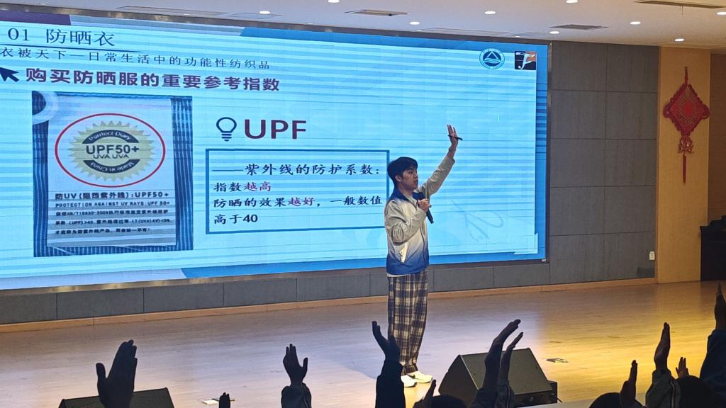 活动现场,主讲人王生域以其幽默风趣、深入浅出的讲解方式,引领学生深入了解纺织品在日常生活与专业领域的广泛应用。。从防晒衣、速干衣等日常用品,到飞机、深海探索器“蛟龙号”,再到宇航服等高科技产品……王生域逐一揭示这些高科技纺织品背后的“织”造奥秘,生动展现了纺织科技如何助力人民福祉与国家发展,点燃学生们心中的纺织强国之梦。