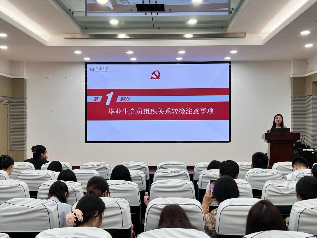 在A103会议室举办2025届毕业生党员集中教育暨组织关系转移培训会。学院党委书记张菁燕,党委副书记、副院长杨莉勤,学工办主任、2025届研究生辅导员任学敏,2025届本科生辅导员张旭,党建辅导员孙婷婷和全体毕业生党员参加会议。会议由张旭主持。