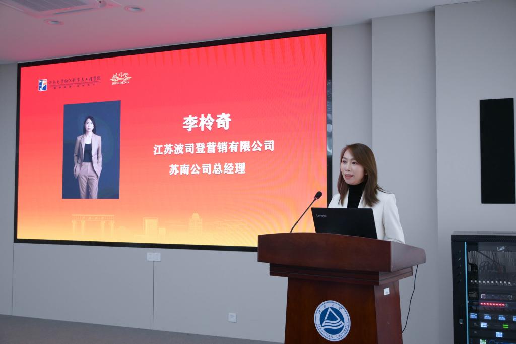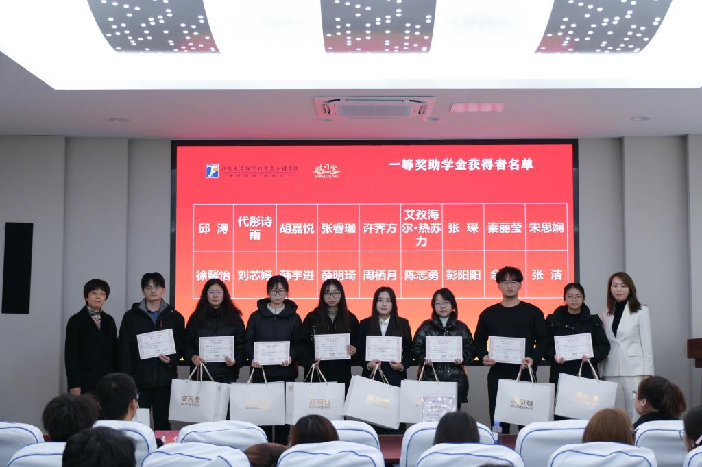 在学院A103报告厅举行2025年“波司登公益奖助学金”颁奖典礼。江苏波司登营销有限公司苏南公司总经理李柃奇、高级零售经理周依婷,海角社区