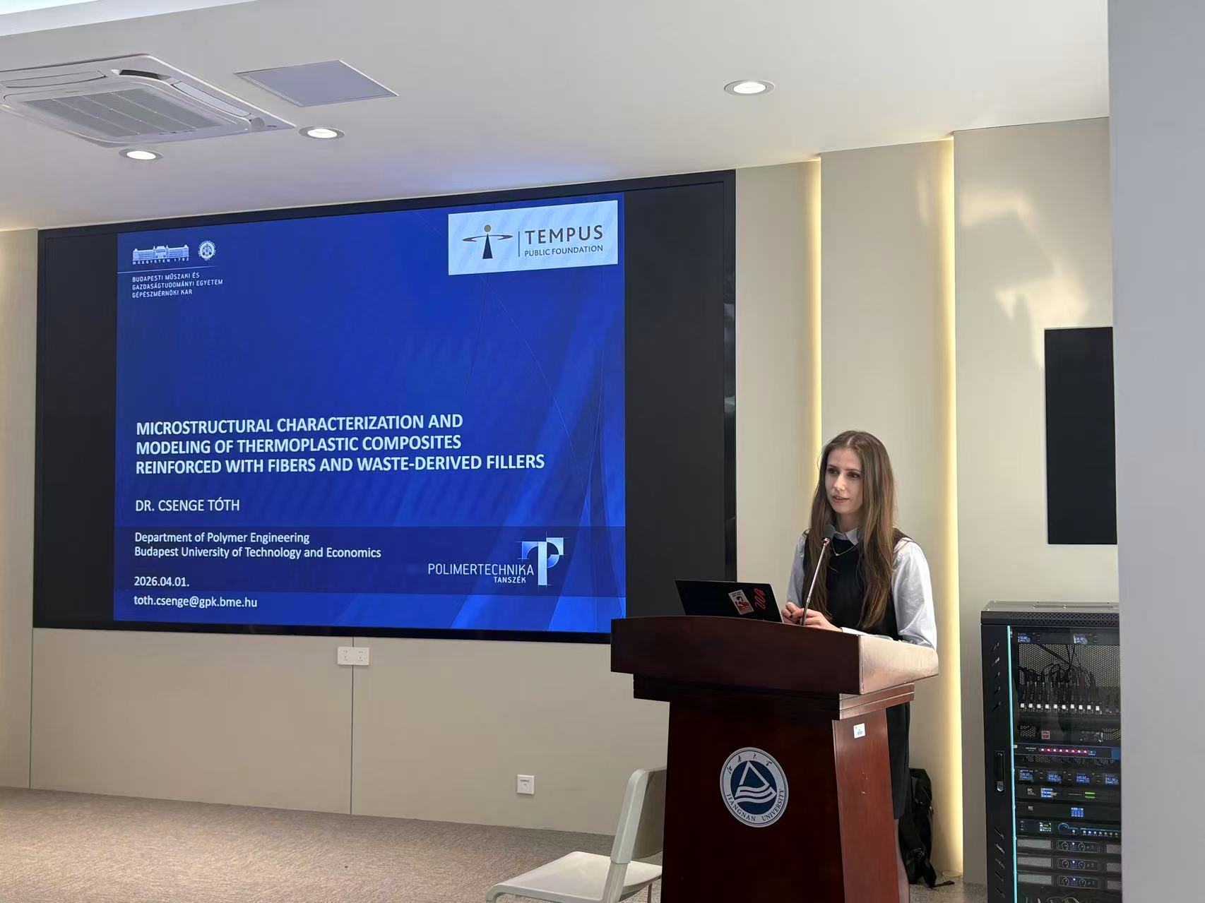 贺海军首先对Csenge Tóth博士的学术背景与研究成果进行了简单介绍,对Csenge Tóth博士的到来表示热烈欢迎。随后,Csenge Tóth博士围绕《Microstructural characterization and modeling of thermoplastic composites reinforced with fibers and waste-derived fillers》(纤维及废弃物衍生填料增强热塑性复合材料的微观结构表征与建模)主题展开深度汇报。