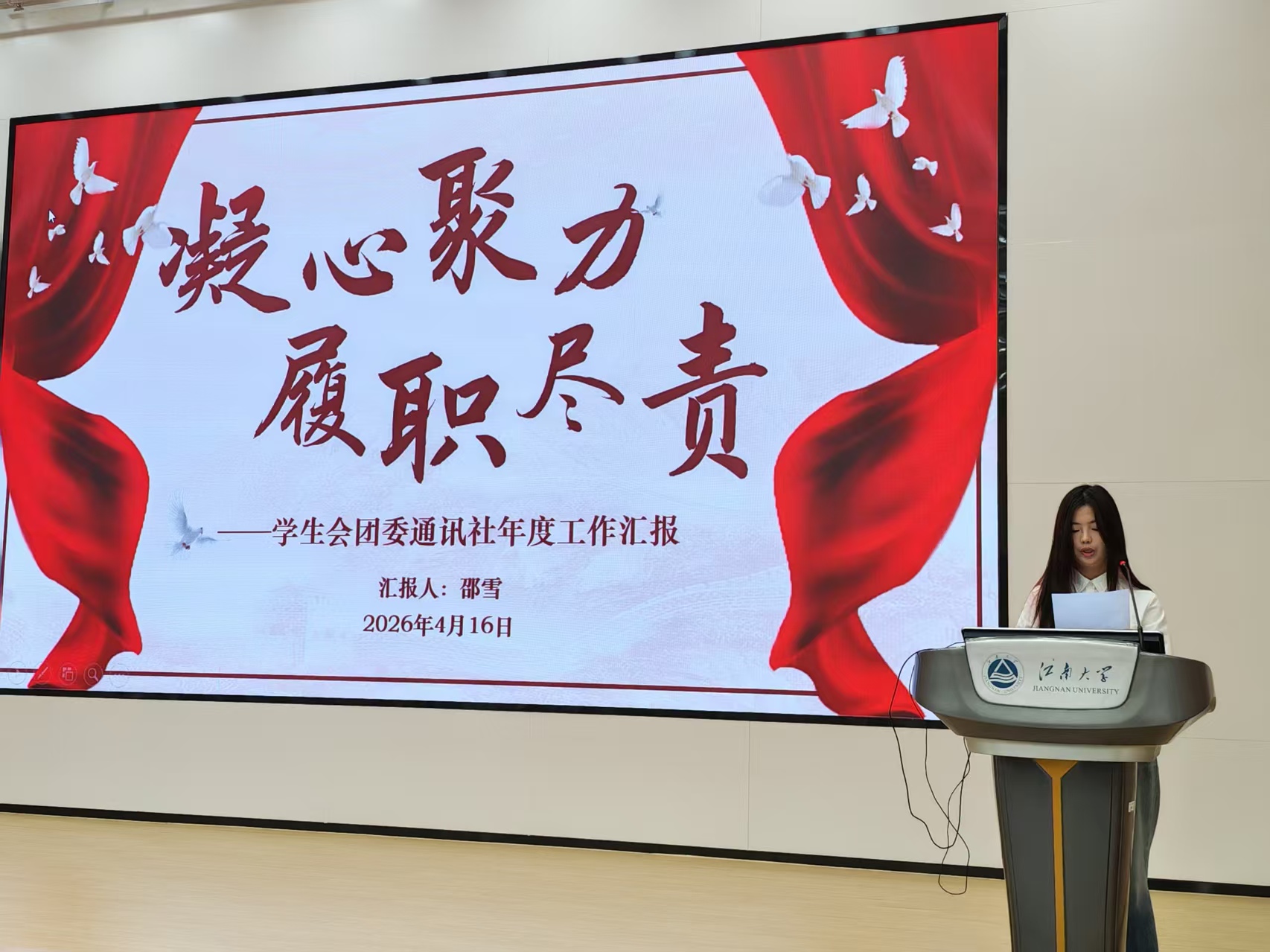 学院学生组织各部门代表立足核心职能与工作实际,聚焦思想引领、学风建设、校园文化、志愿服务、创新创业等重点领域,围绕年度工作成效总结、问题分析与改进、未来工作规划与展望等方面依次述职。会上进行了现场综合评分,并对获评本学年“优秀干事”称号的学生骨干予以表彰。