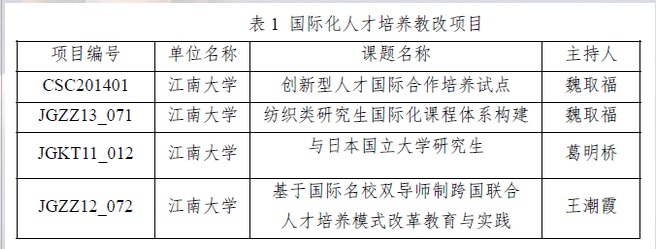研究生培养更注重与国际化人才培养模式相接轨,与世界纺织专业著名高校、研究机构和公司,如North Carolina State University、UC Davis、Georgia Institute of Technology、德国卡尔迈耶集团公司、英国染色家协会等开展产学研合作和研究生联合培养;通过国家公派留学项目,王清清等20余名博士完成赴国际名校联合培养,张燕婷和孔震等同学赴德国卡尔迈耶集团公司参与国际先进企业技术的引进和消化,增强了研究生的科研视野和研究水平。在国际化研究生人才培养方面,主持了4项教改项目(表1),利用举办第五届国际纺织生物技术、第一届生态纺织可持续发展、12届亚洲纺织会议(分会场)、先进功能纺织材料国际研讨会和纺织生物技术研讨会等国际学术会议,扩大了参与国际合作的纺织领域专家的范围。联合了美国、英国、比利时、德国等11所世界著名纺织院校的学者编写出版了专著《Surface Modification of Textiles》(魏取福教授任主编),英国著名的纺织出版社Woodhead出版,自2009年7月出版以来已被90多家国内外图书馆收藏使用,并被英国Heriot-Watt大学等高校推荐为研究生辅助教材。以该著作为教材的海角社区