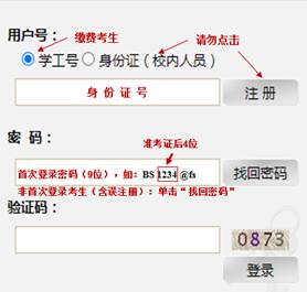 网上缴费平台”,完成缴费。考生账号已开通,切勿自行注册。收费标准:80元/生(仅申请考核考生,硕博连读考生无须缴费)。用户号在“学工号”输入正确的身份证号,初始密码(9位):“BS”+准考证编号后4位+“@fs”(准考证查看网址://yzgmis.haijiaopt.net/zsgl/bswb/login.aspx),如“BS1234@fs”。非首次登录缴费系统的考生(含往年报考考生及误注册考生)请使用“找回密码”,登录并缴费。